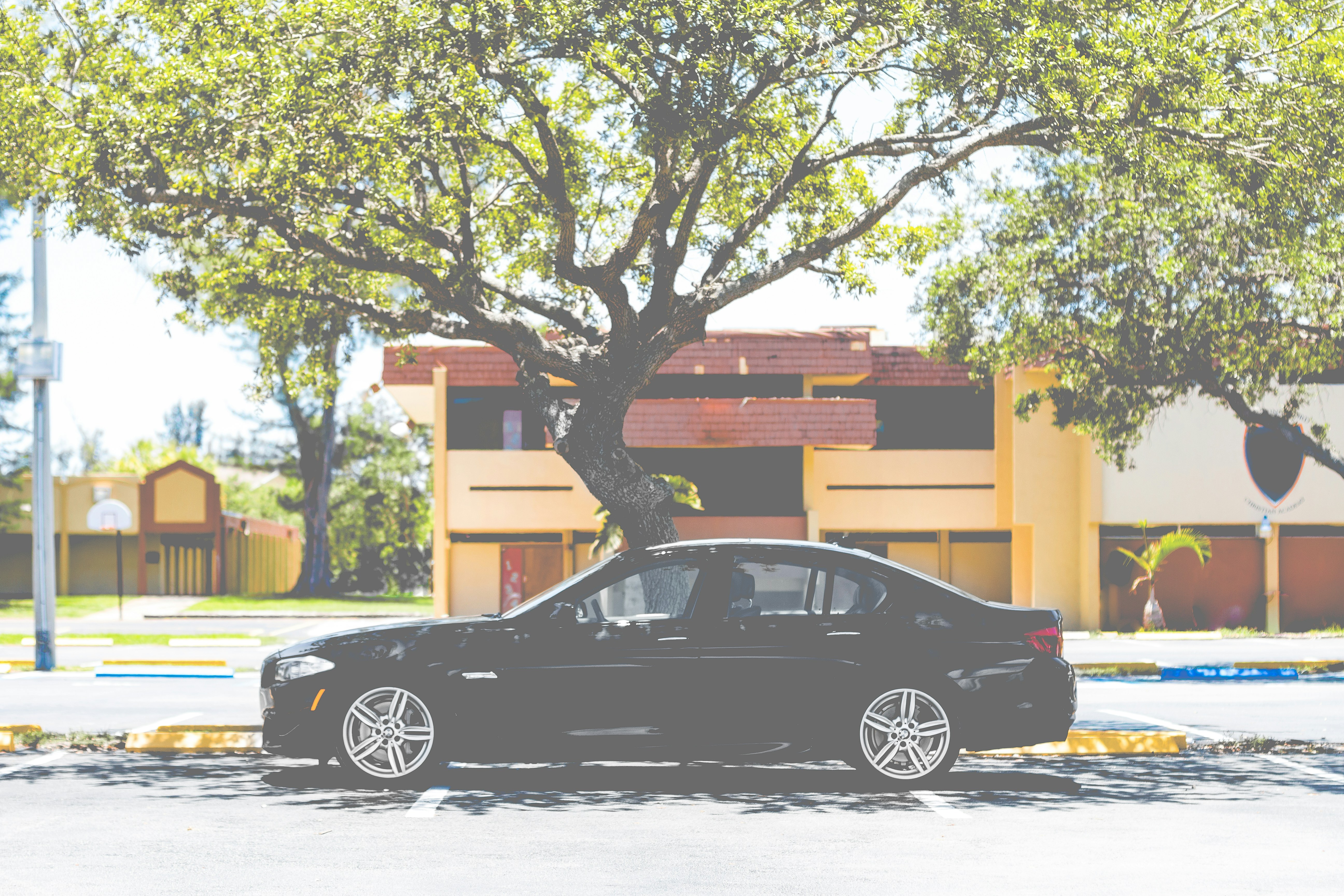 汽车、黑色轿车、宝马、轮式车辆、交通、机动车、汽车、汽车、车辆、停车场、街道、道路、树木、建筑、合金、佳能、黑色、爸爸、城市、德国