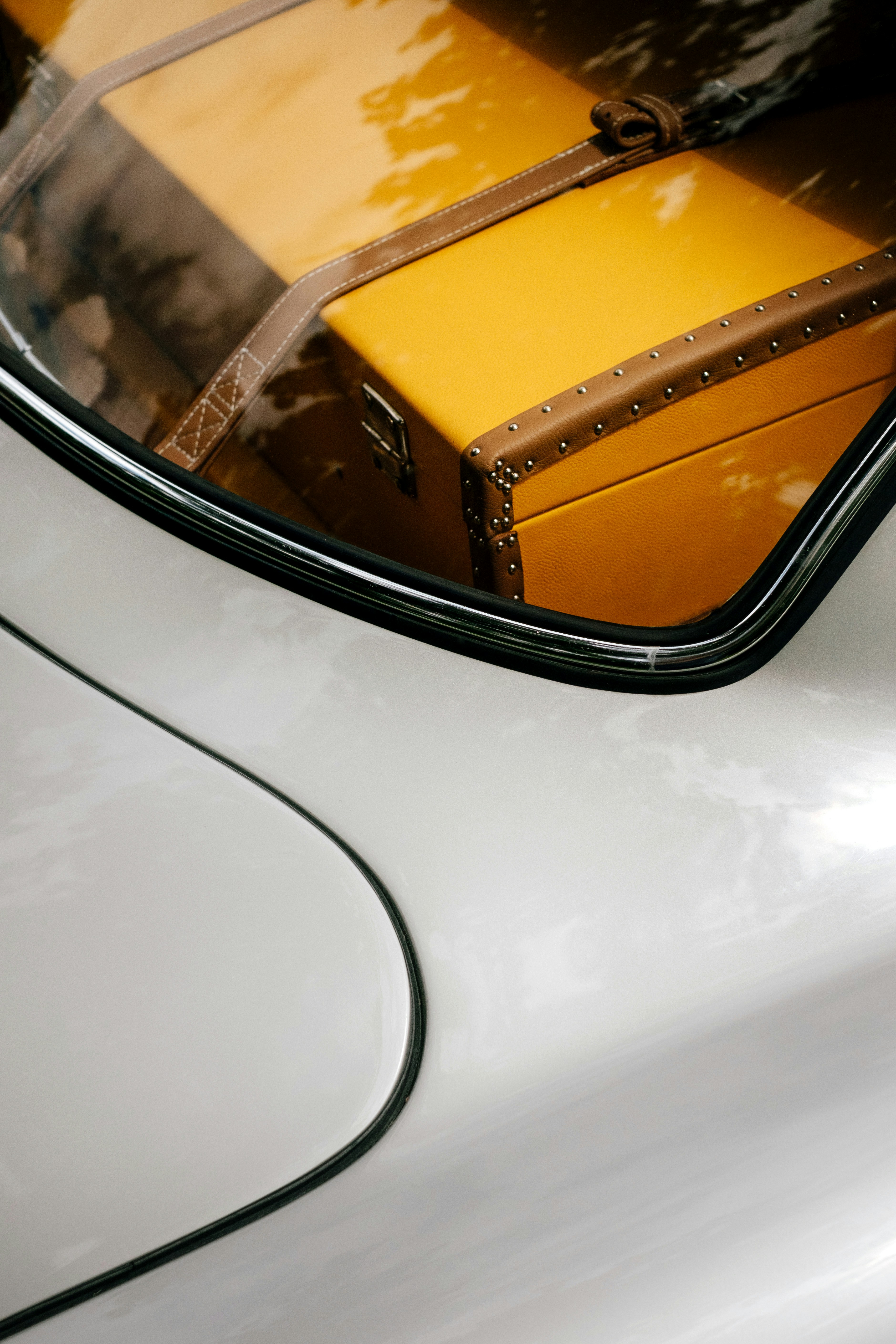 手提箱、汽车、度假、旅游、旅游、灰色、灰色、古董车、古董车、车辆、行李箱、行李箱、车窗、倒影、复古、黄色、皮带、曲线条、线条、最小尺寸