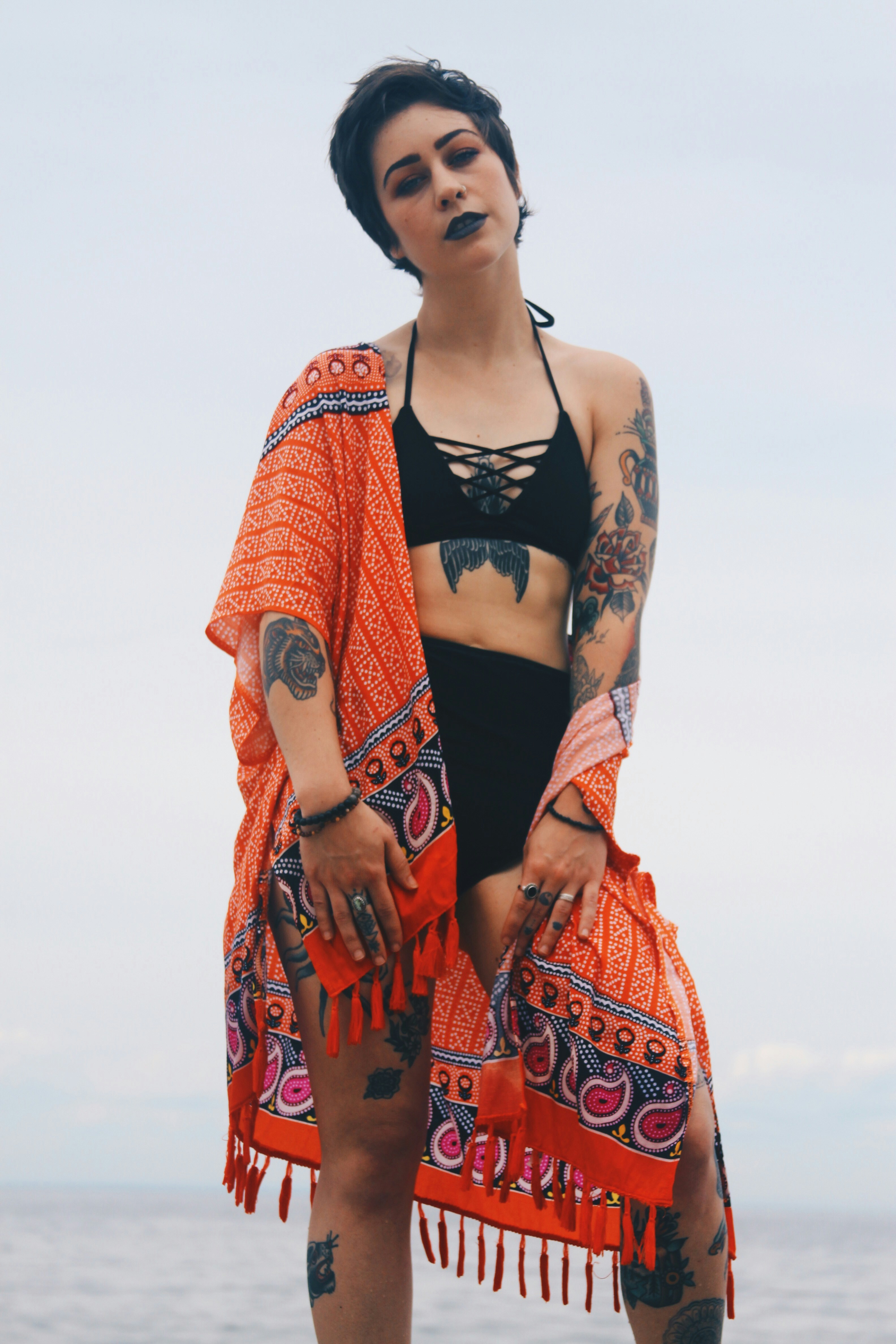 一个穿着黑色比基尼的短发女人穿着一件橙色的被大海遮盖的衣服
