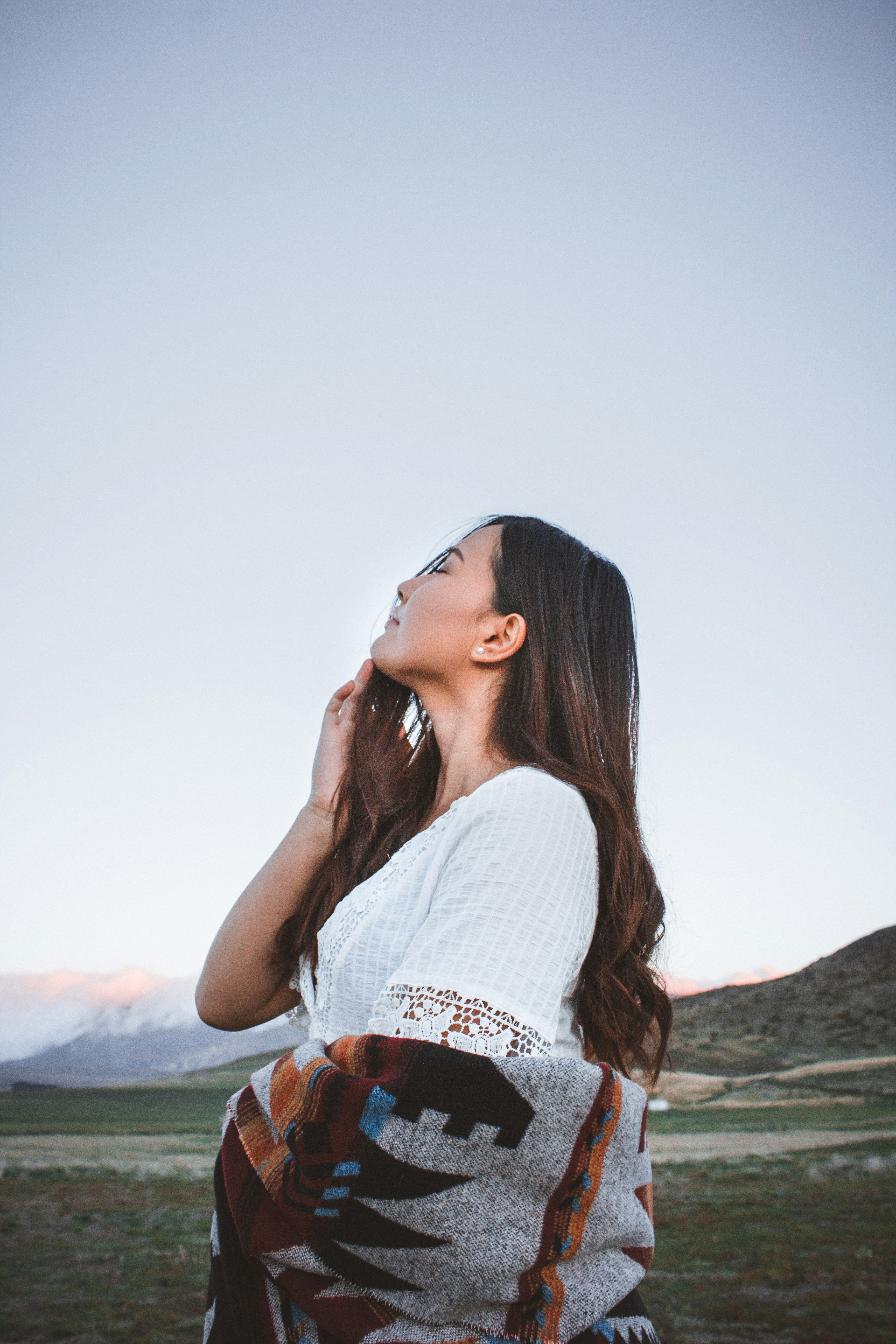 山,人,肖像,轮廓,女人,头发,脸,自然,模型,衣服,毯子,日落,姿势,时尚,手,看,休息,禅,欢乐