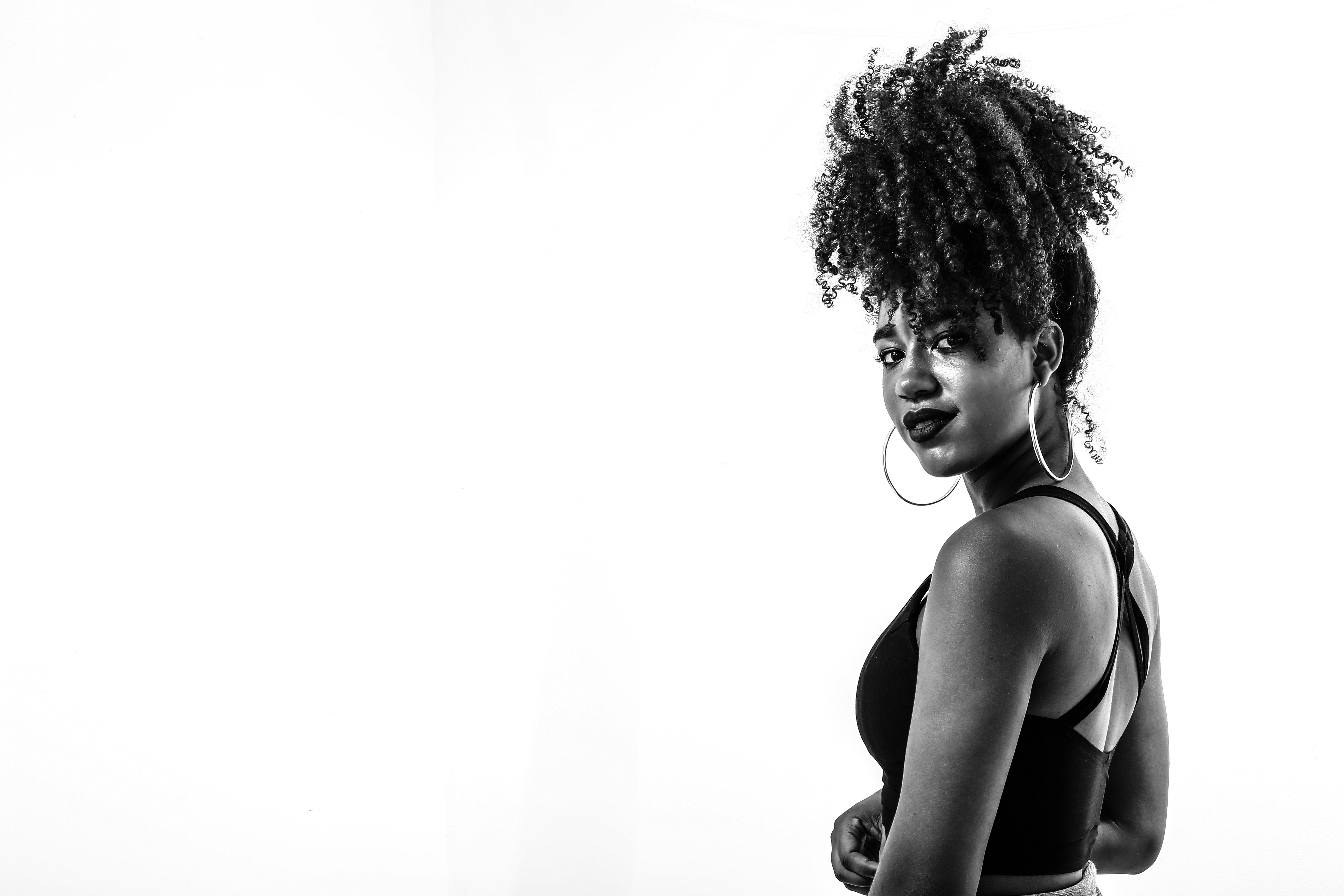 非洲裔美国人,黑白相间,肖像,皮肤,肩膀,头发,耳环,箍,眼睛接触,最小肖像,脸,女性,女人,白色空间