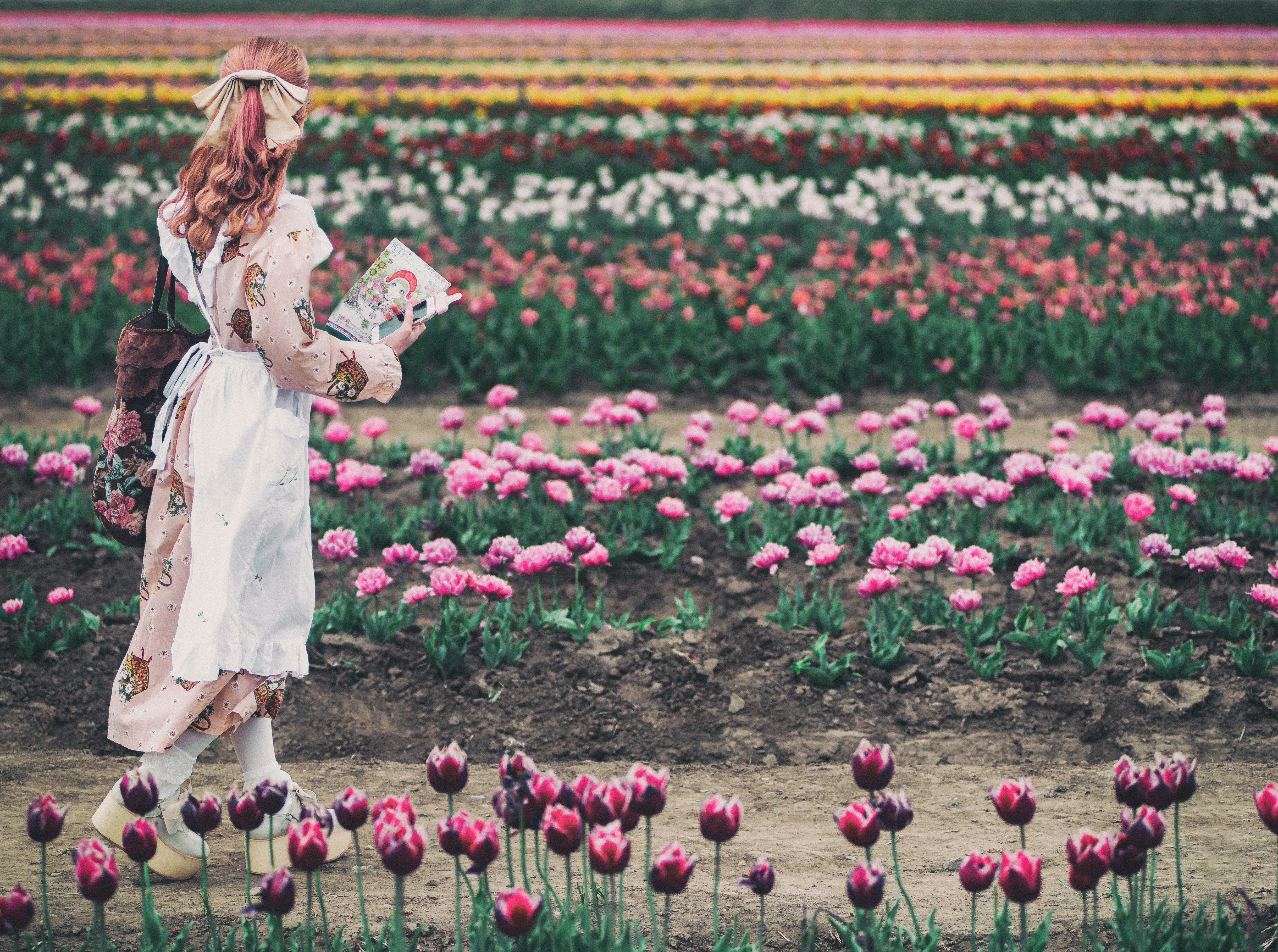 花卉、田野、郁金香、花卉、花园、郁金香花园、时尚、美丽、散步、自然、粉色、绿色、樱花、日本、色彩、日本、服饰、色彩、女孩、sakura chi