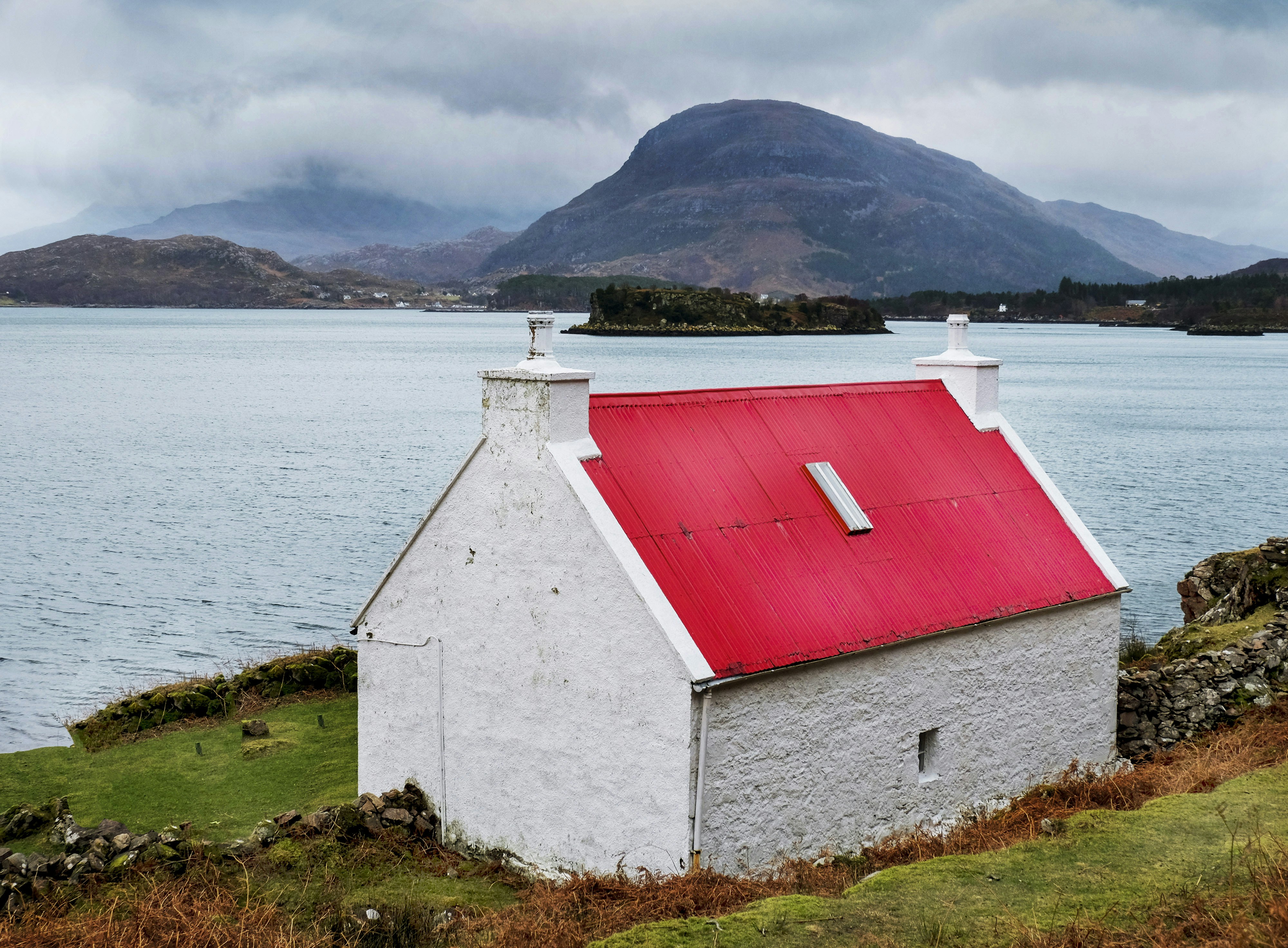 山,云,湖,草,海岸,海,天空,建筑,水,红屋顶,海湾,绿色,房子