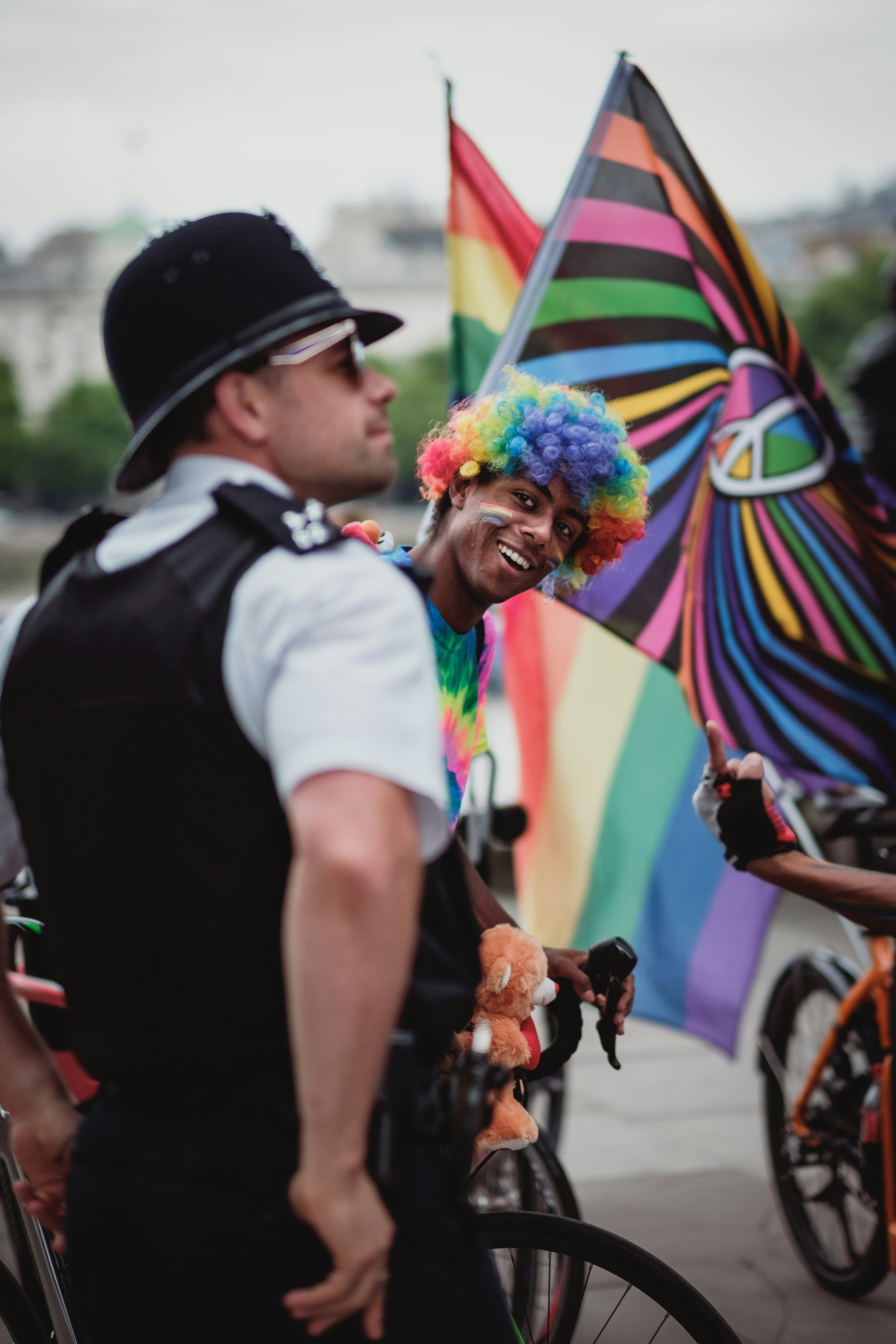 微笑,人,国旗,非洲,彩虹,颜色,户外,警察,服装,服装,LGBT,多样性,颜色,友好,男人,男人,男人,非洲裔美国人,自行车