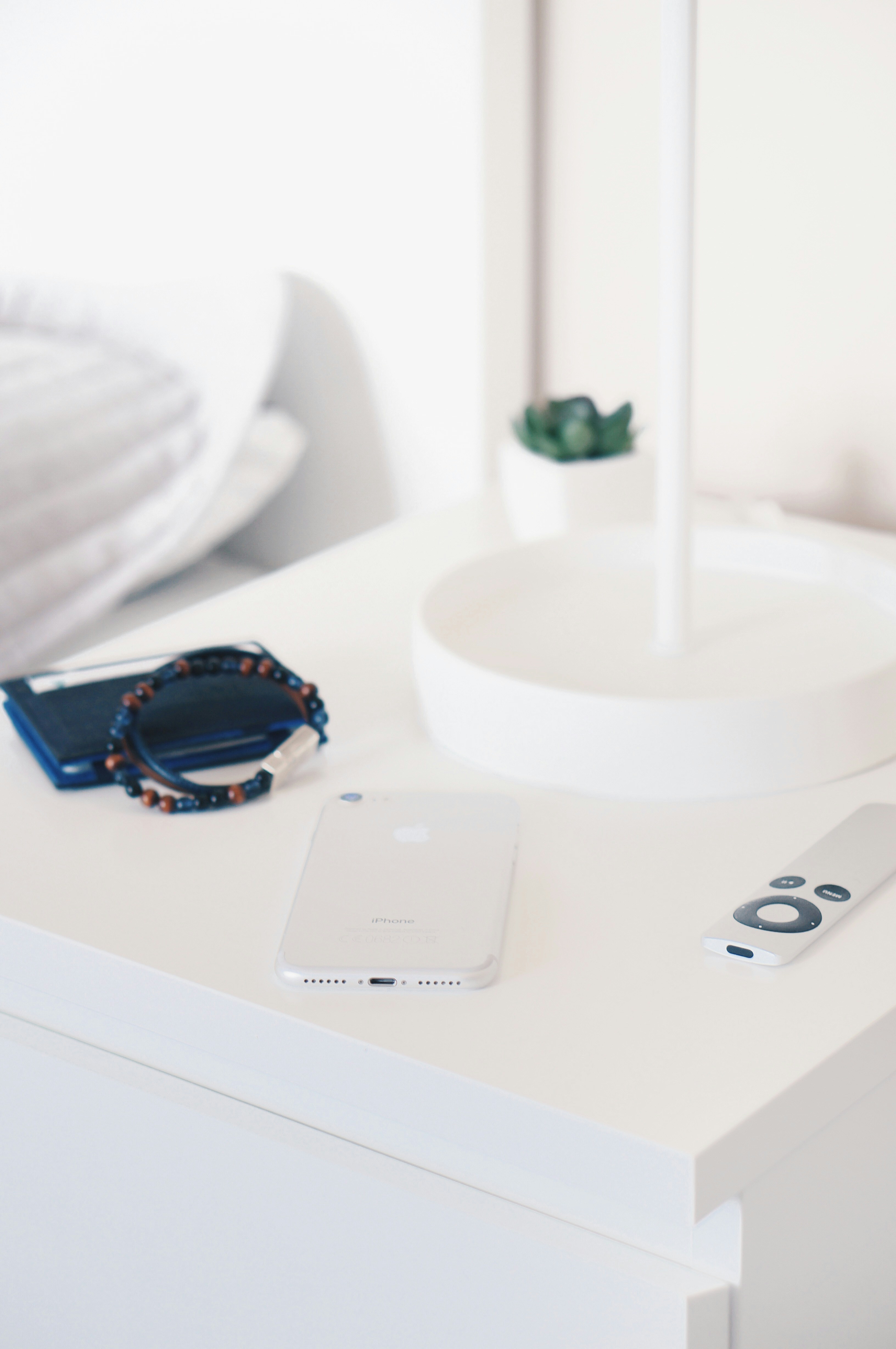 床头桌,室内设计,室内,床边,极简,极简,设计,基本,简单,风格,白色,肉质,电话,遥控器,手镯,简洁,单色,单色,极简,iphone7