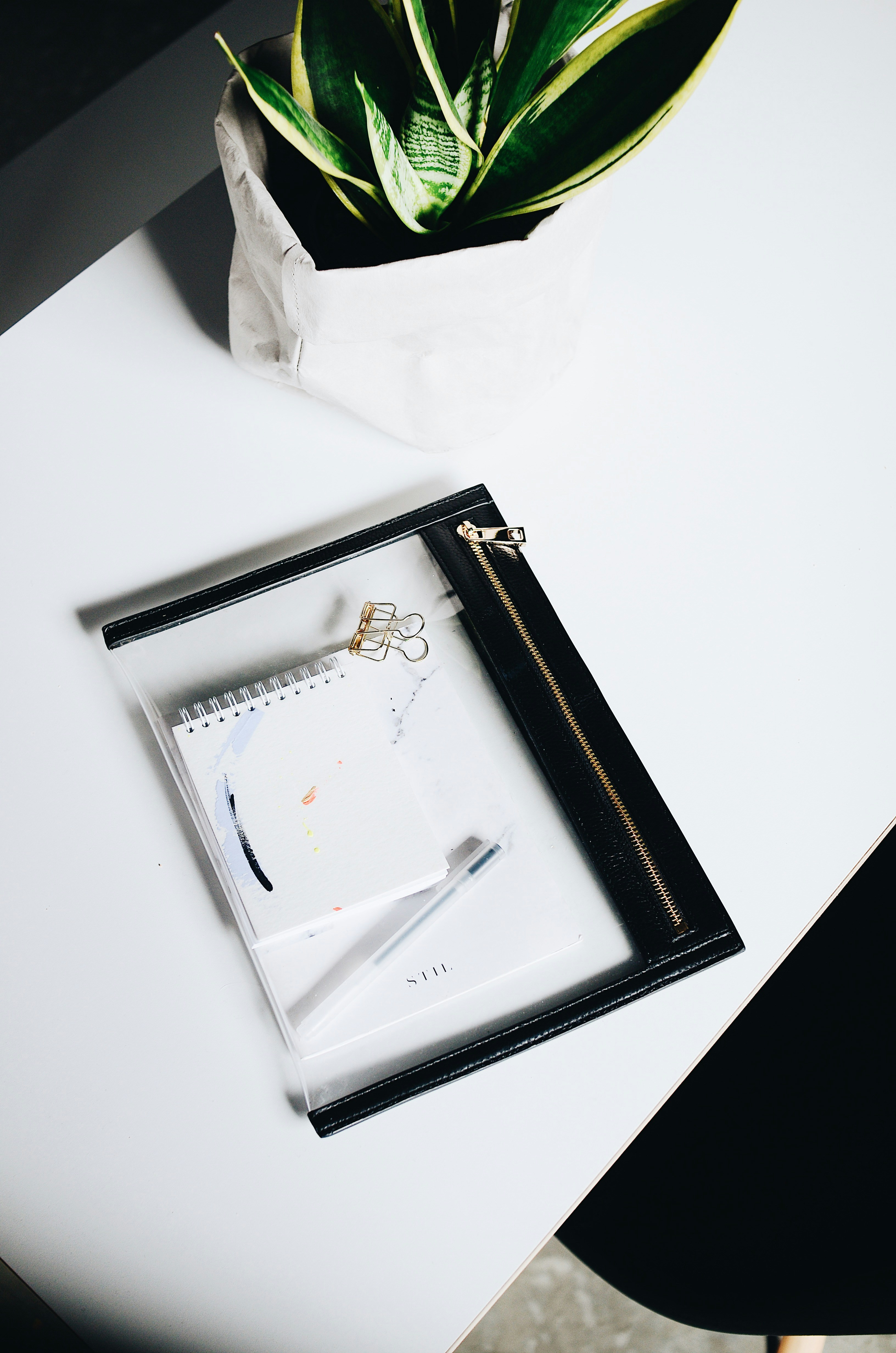 书桌,笔记本,植物,盆栽,种植,拉链,拉链,钢笔,纸,白色,桌子,办公室