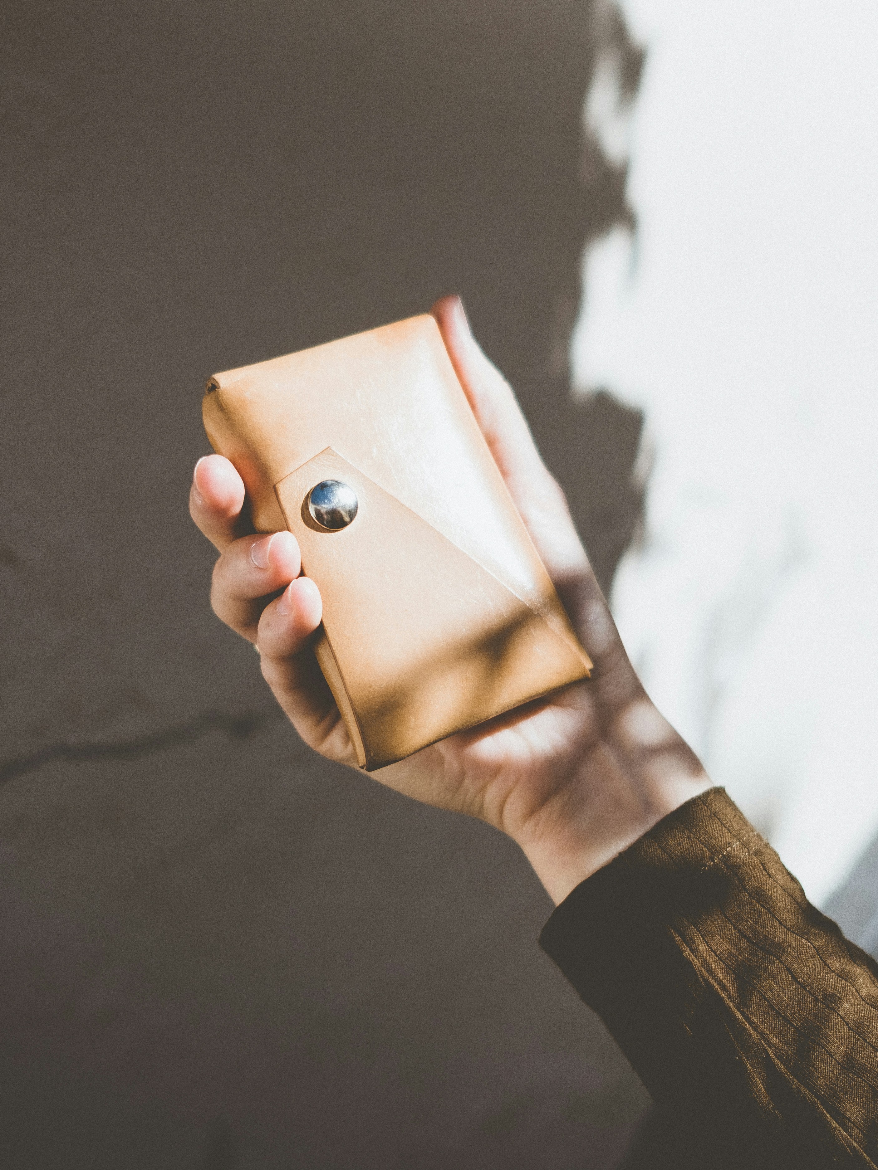 钱包、钮扣、手、握住、影子、阳光、手臂、白种人、皮革、秋天、铜锈、阳光、阴郁。