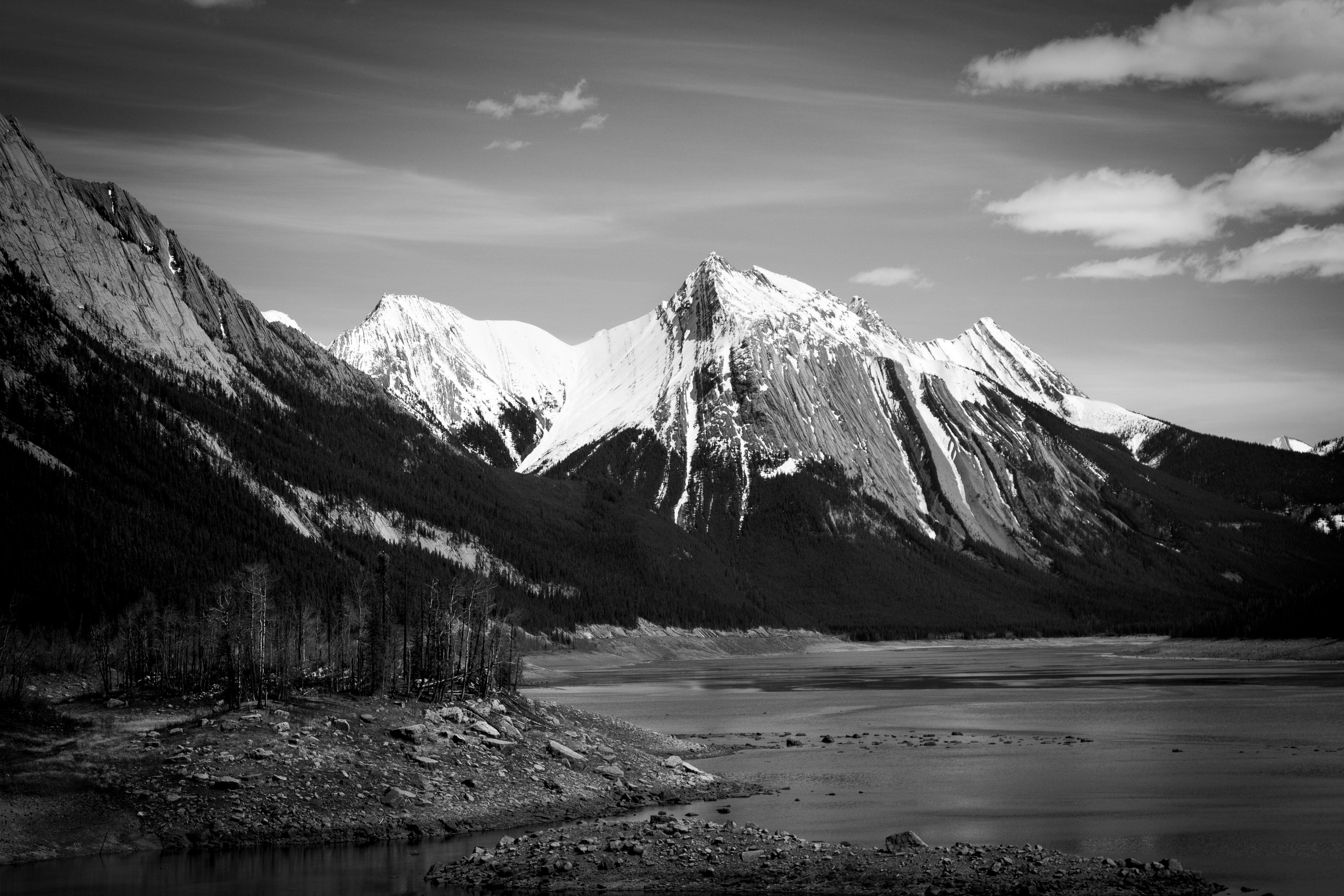 高山,山顶,天空,云彩,山顶,雪,加拿大,艾伯特姆,树