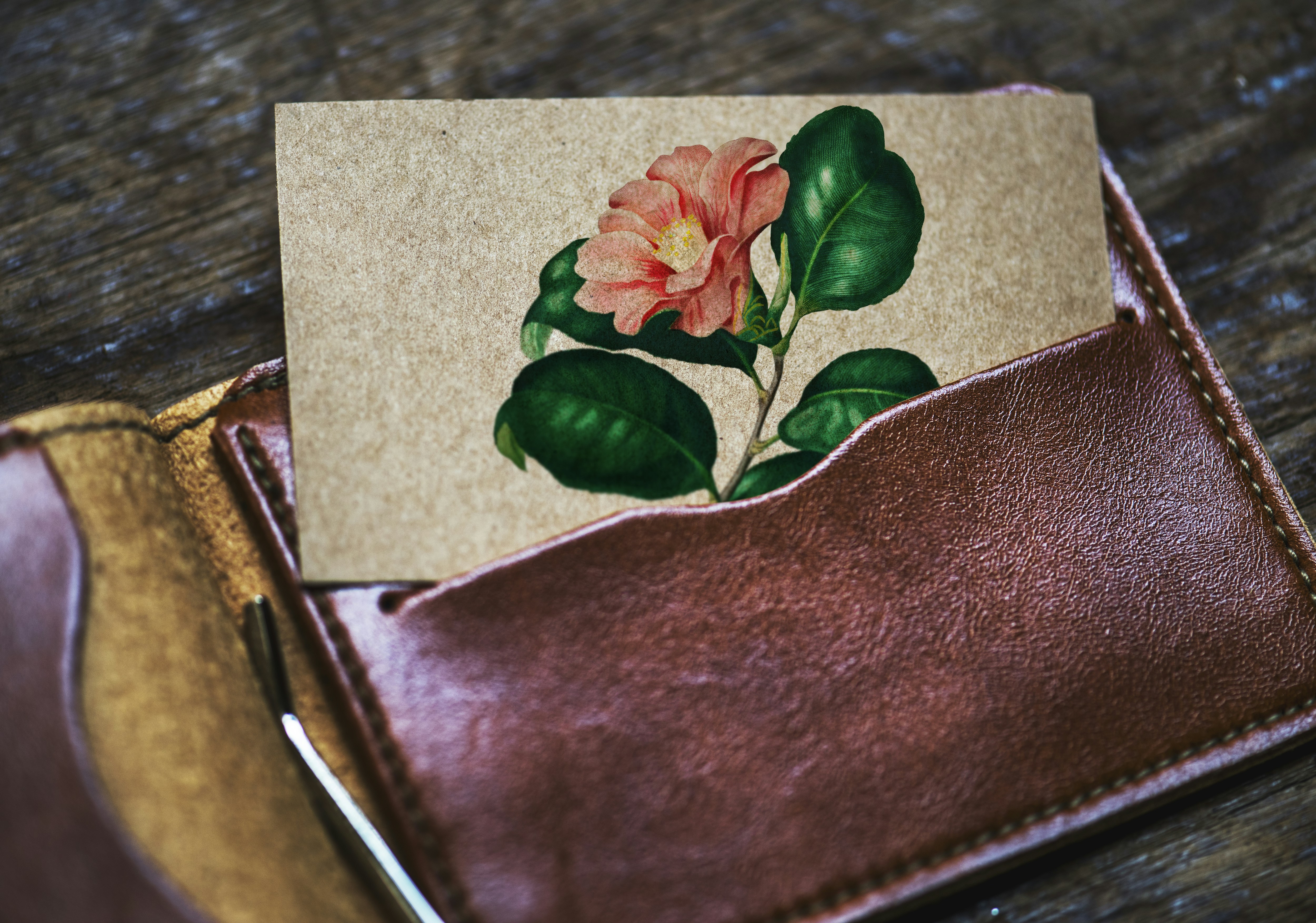 橙色花瓣印刷卡在打开的棕色皮革双钱包