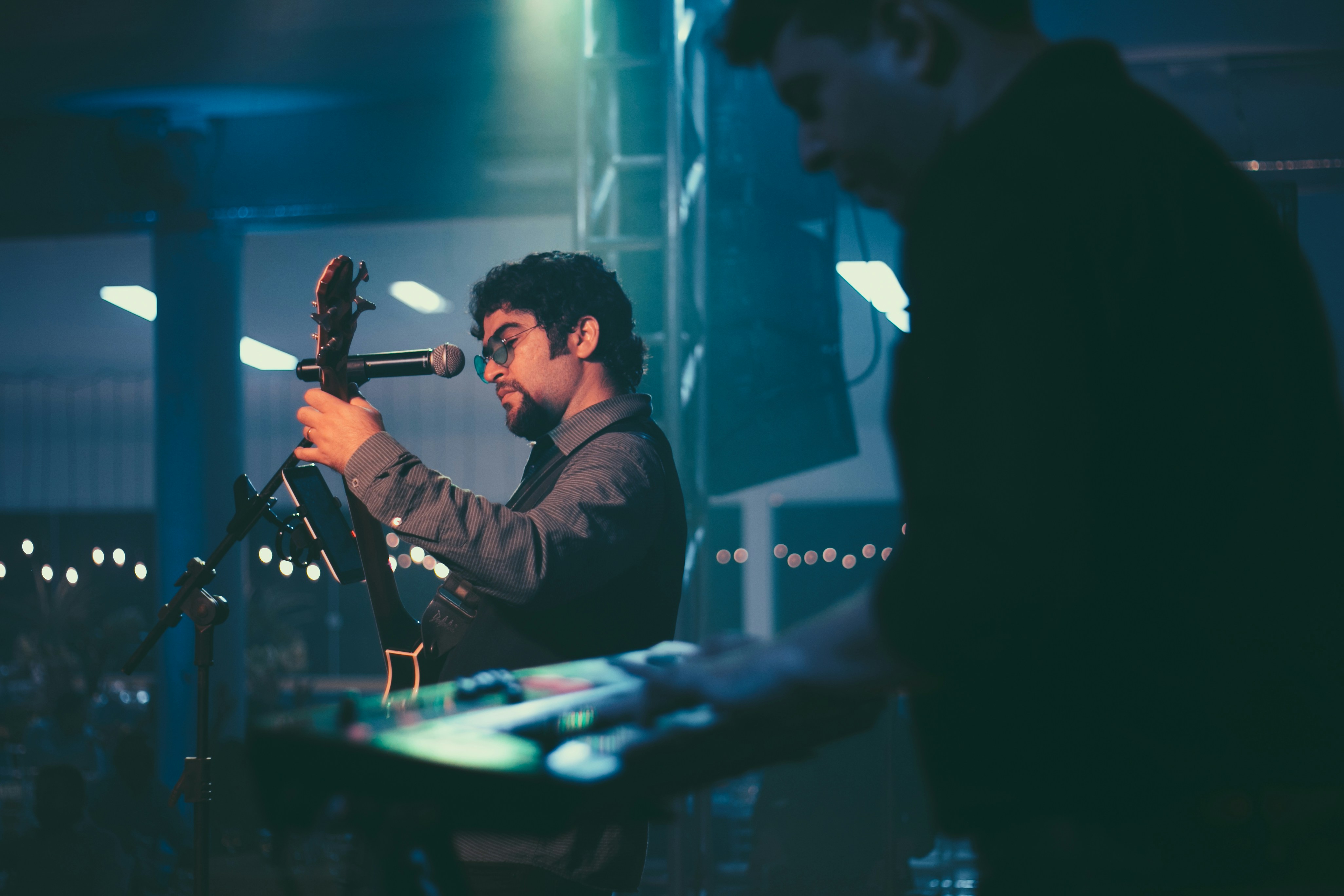 男,麦克风,男,吉他,乐器,键盘,表演者,表演,乐队,签约人,演奏,灯光,黑暗,夜晚,音乐会,吉他,滚轴,摇滚