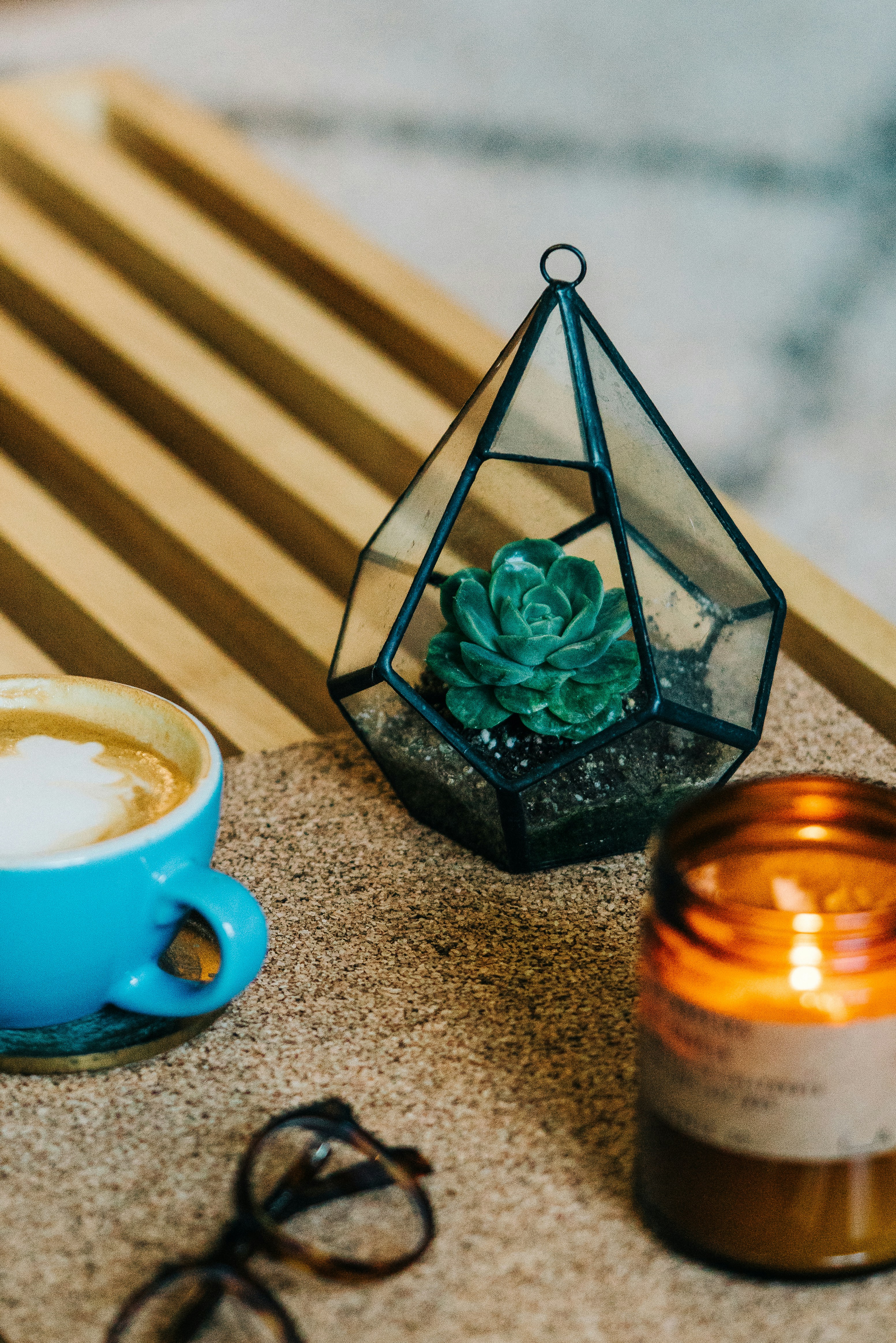 肉质、阳台、桌子、装饰、杯子、饮料、蜡烛、火焰、燃烧、玻璃、罐子、玻璃杯、植物、软木