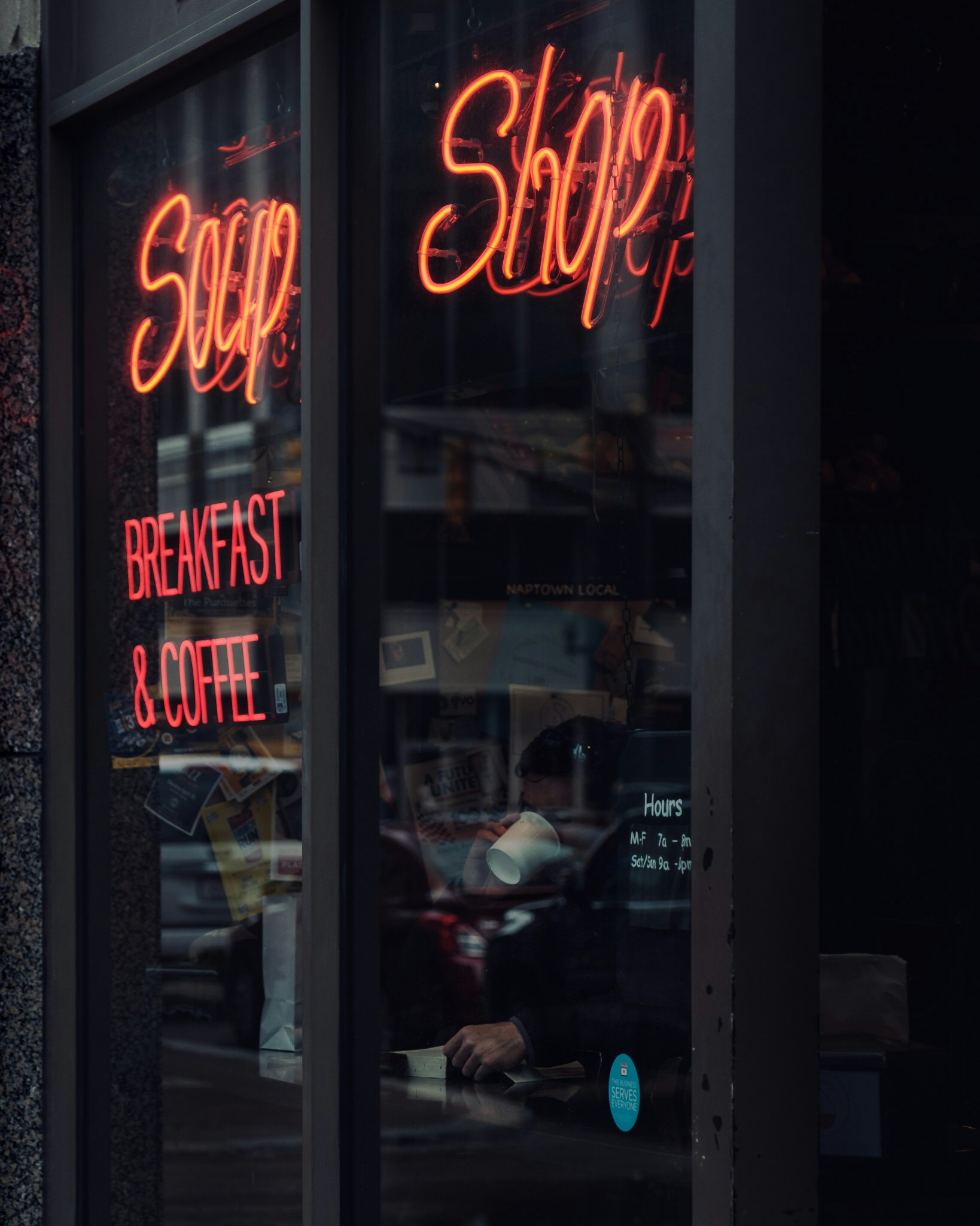 霓虹灯、窗户、玻璃、咖啡厅、咖啡厅、餐厅、早餐、饮料、饮料、街道、汤、人、标牌、城市、印第安纳波利斯、市中心、霓虹灯、复古