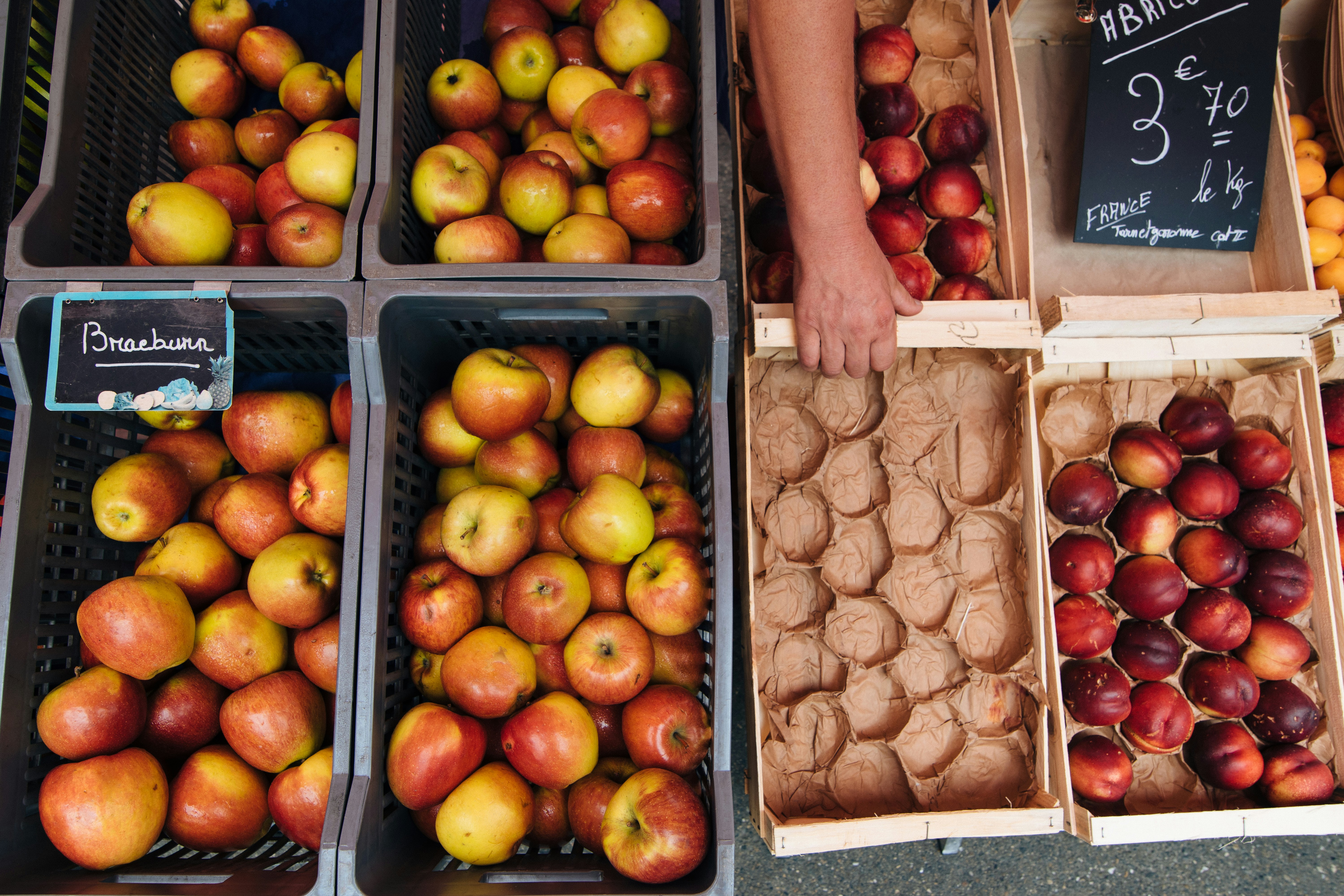 A bald man in uniform is carrying parcels next to a busy street in St. Lawrence Market.