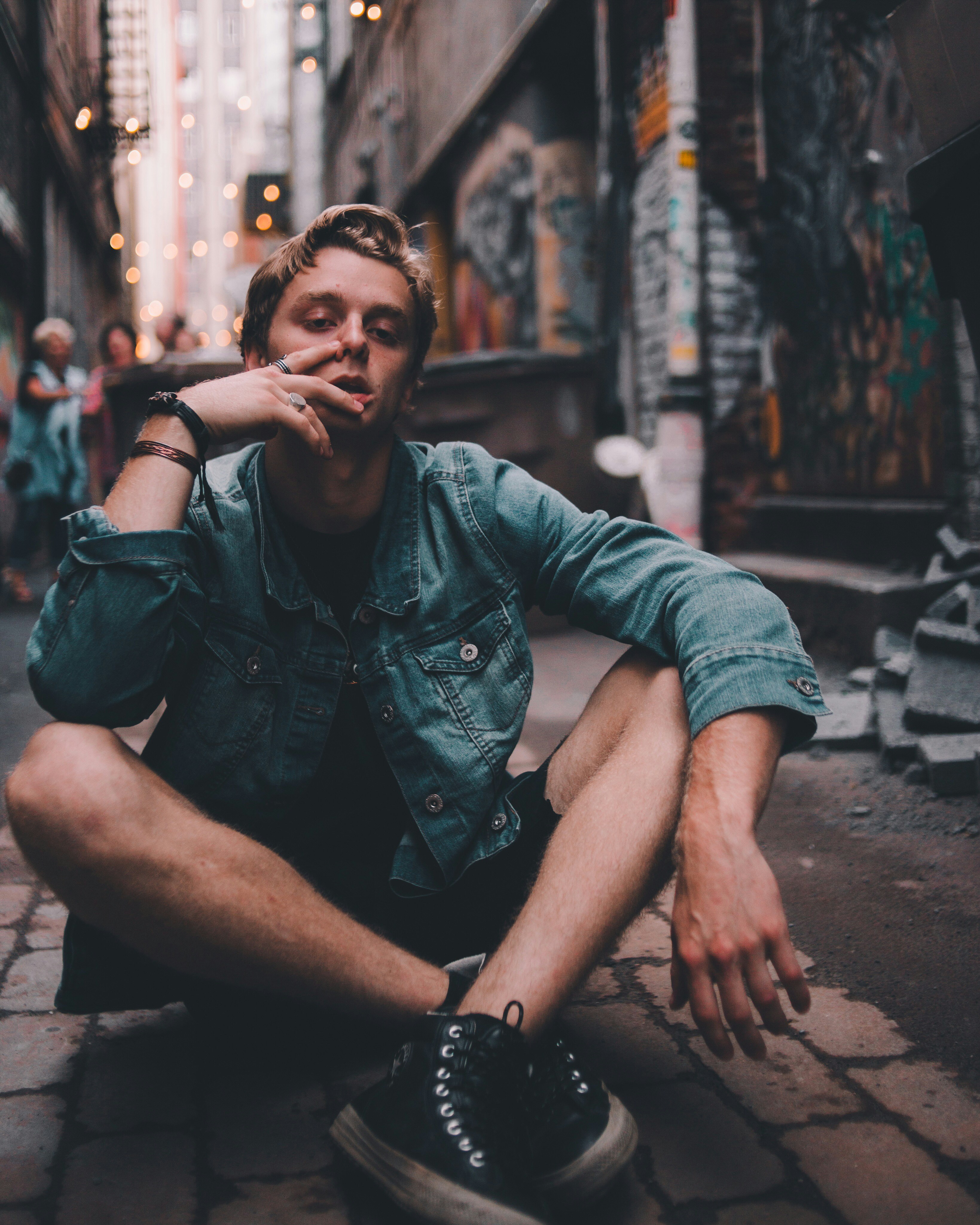 人,坐着,牛仔裤,胡同,胡同,运动鞋,肖像,城市,城市,动人的脸,黑暗,喜怒无常,脾气暴躁,男人,金发,年轻,涂鸦,废话
