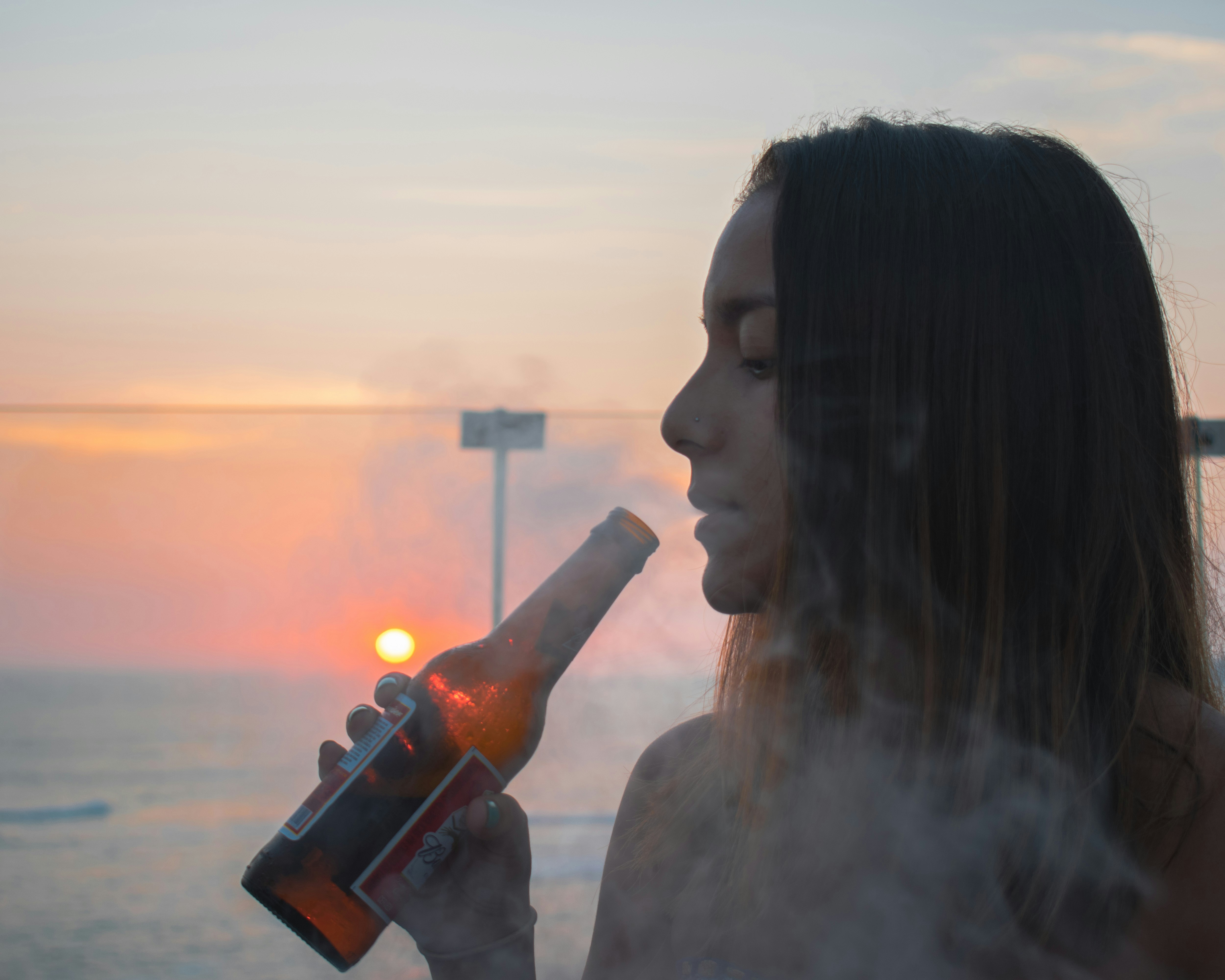 女人,女人,啤酒,烟,饮料,日落,长发,放松,酒精,标志,水,海洋,颜色,海滩,天空,自然,自然,头发,VAPE,蒸气,夏天