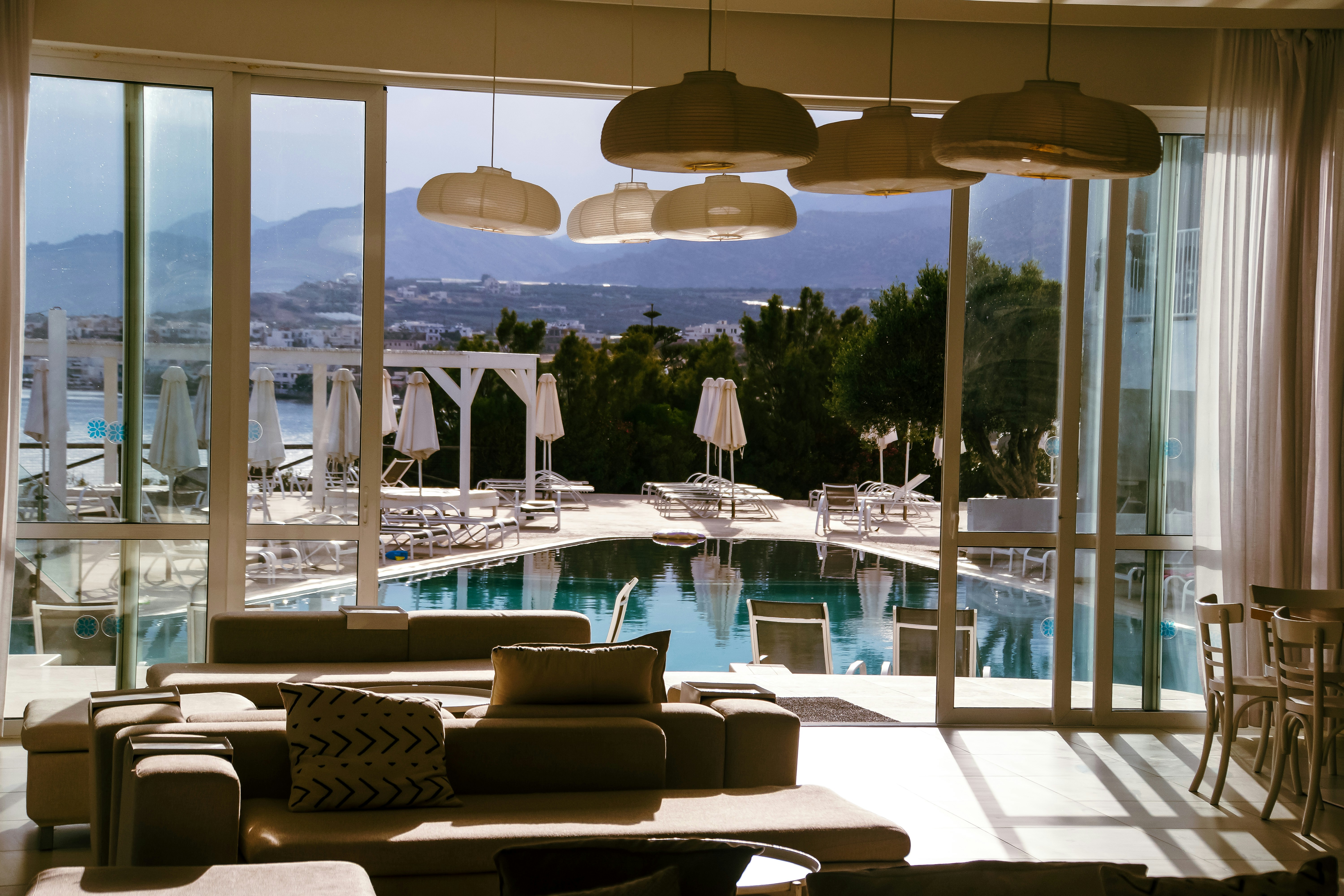 游泳池,酒店,度假村,休息室,沙发,灯,暖和,假期,假日,门口,黄昏,游泳池,冰球,希腊,宁静,夏天