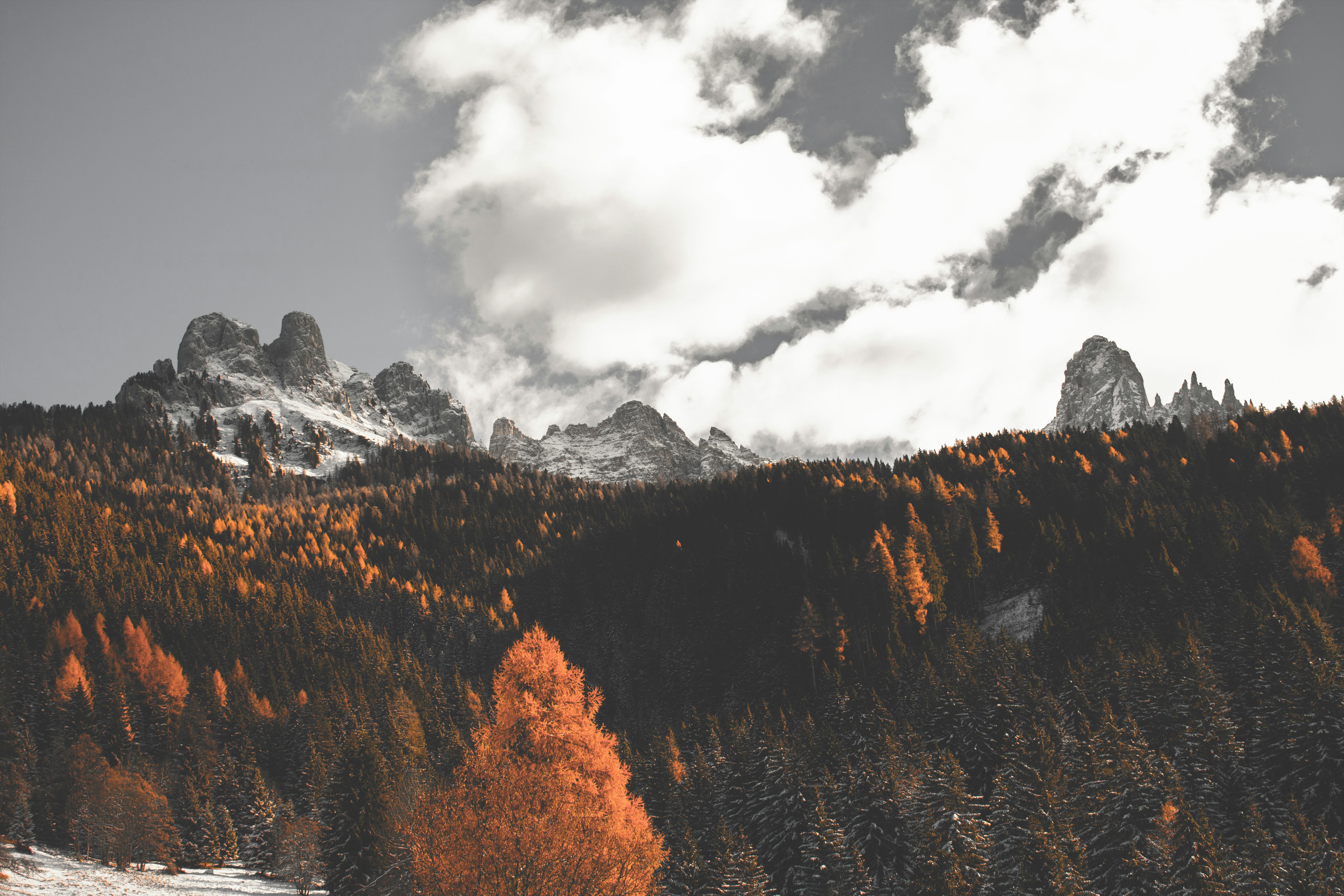 岩石,树木,云层,雪,秋天,山,冬天,CARZZA,意大利,南蒂罗尔,白云石,木材,树木