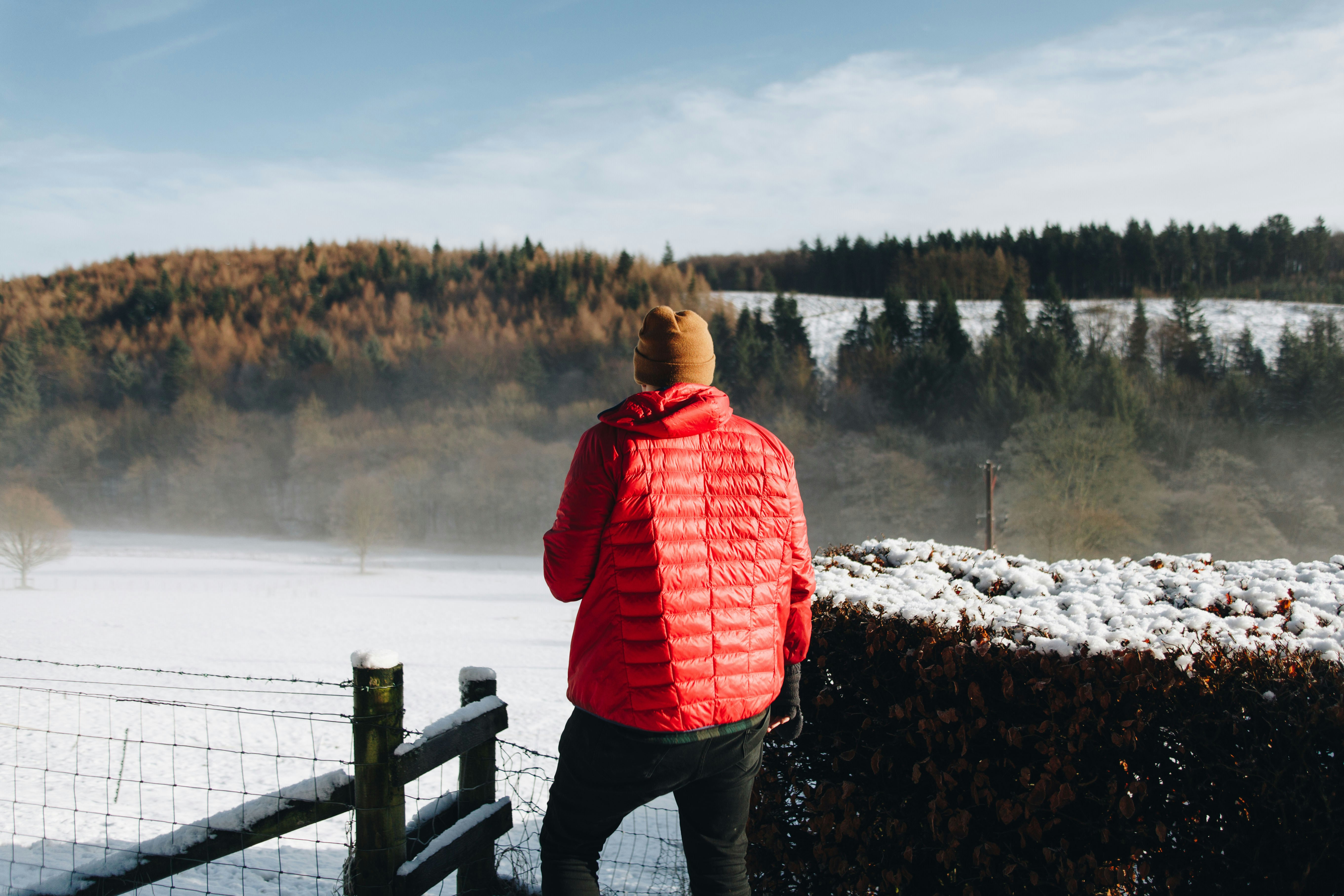 男人,男人,红色,外套,风景,雪,冬天,篱笆,木头,铁丝网,篱笆,灌木,树木,林地,森林,田野,丘陵,山,创意,摄影师
