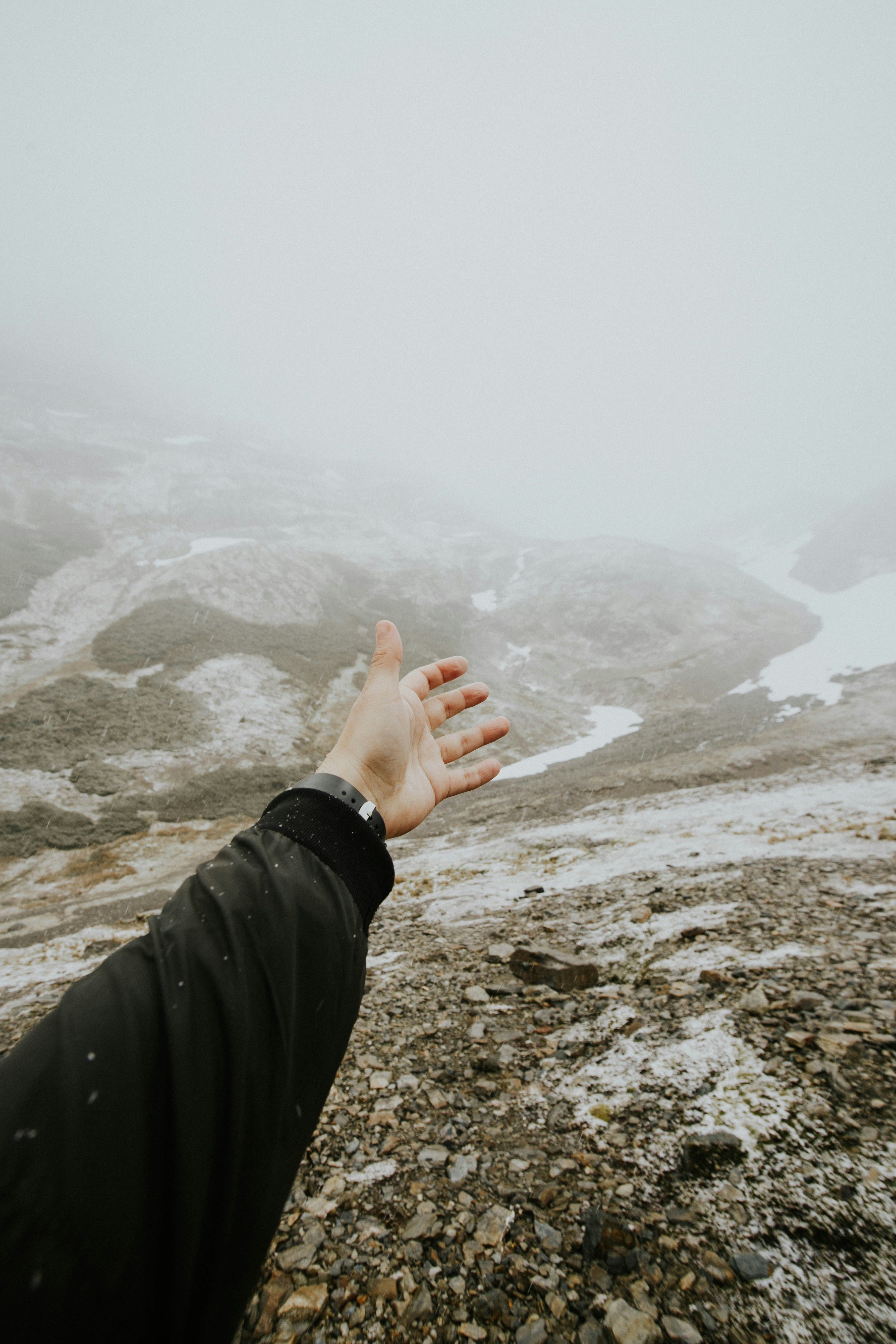 手,地平线,雪,山,隘口,山谷,岩石,手臂,雾霭,多雾