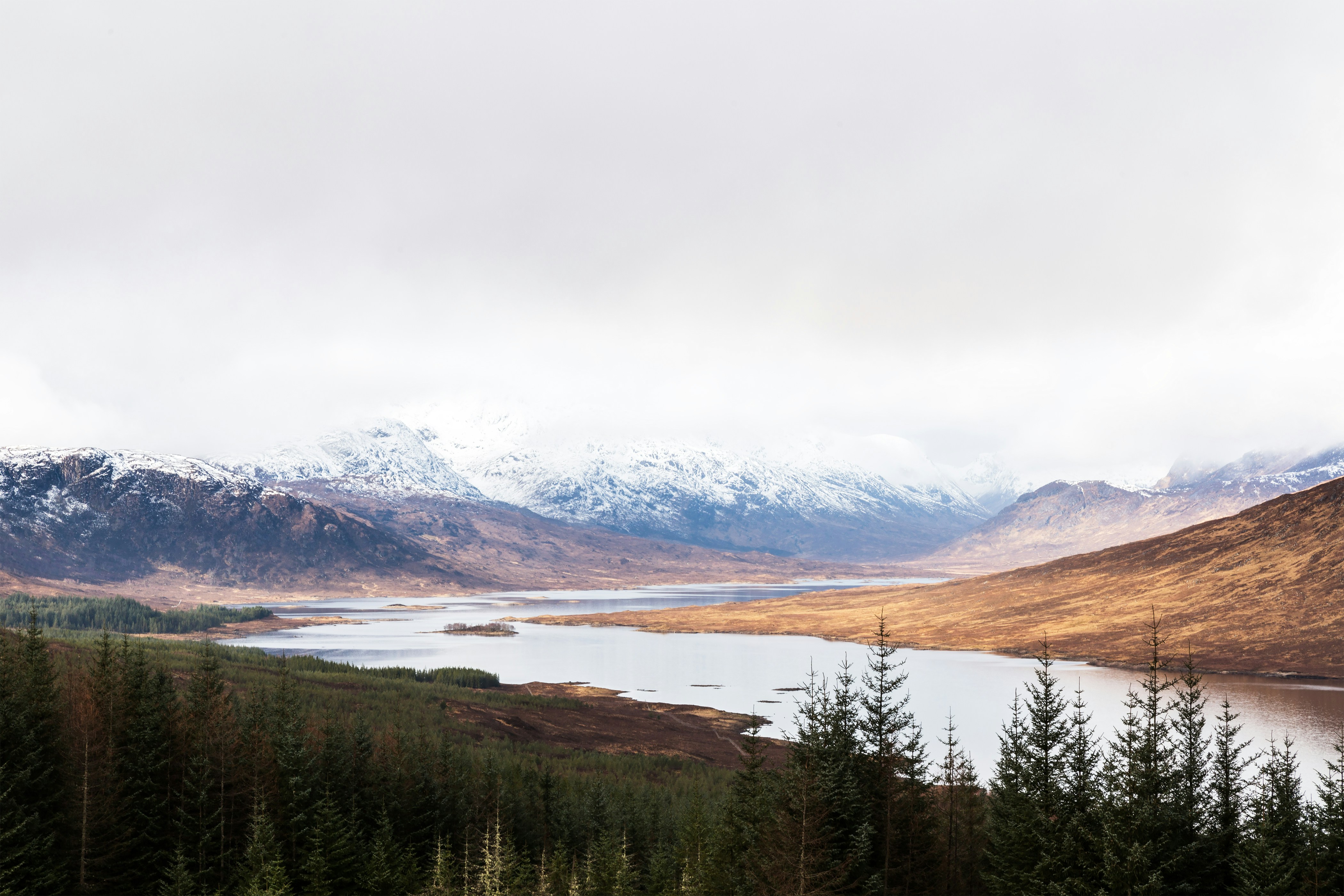 山谷,山,树,湖,雪,河,苏格兰,神秘,云,松,风景