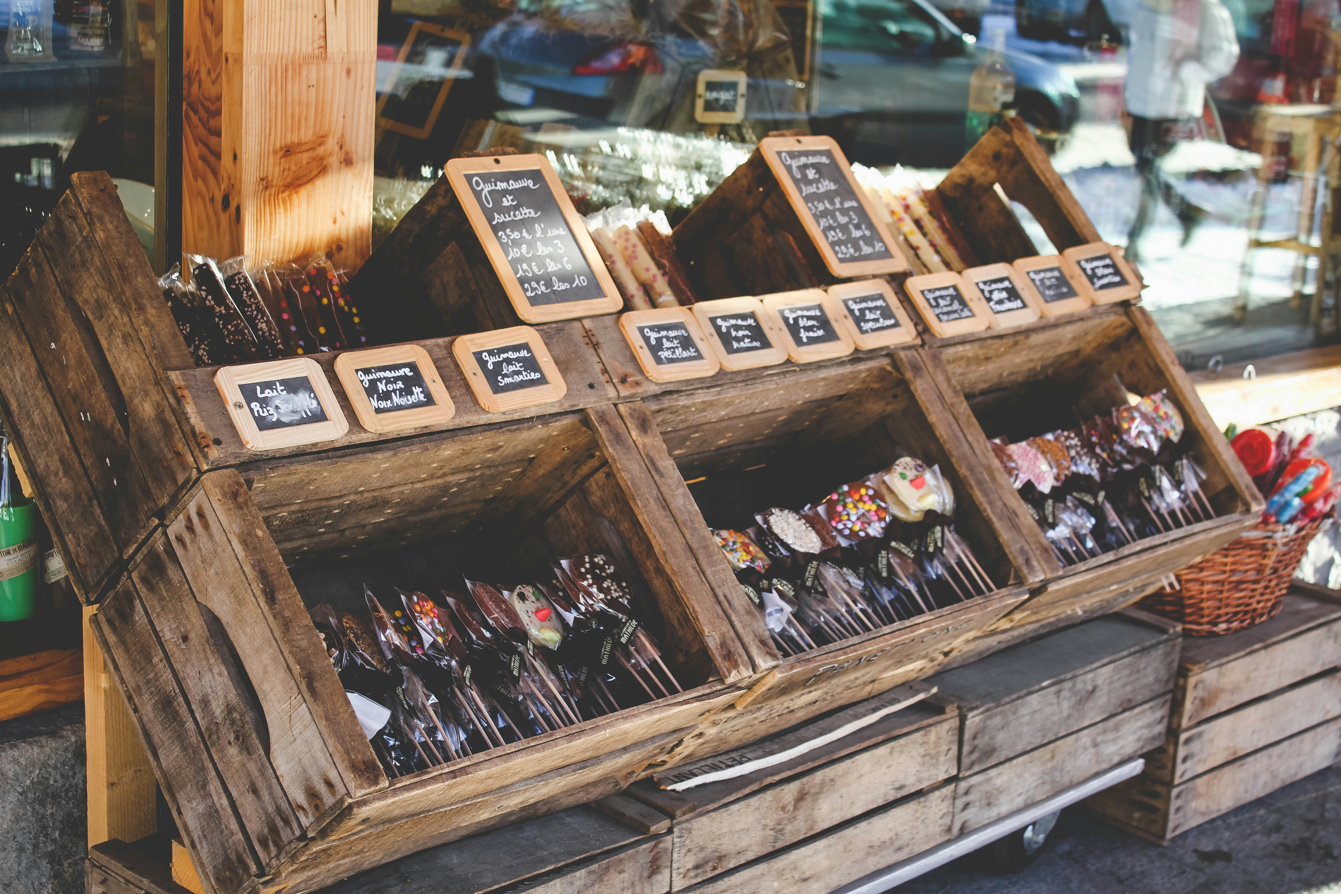 板条箱、木箱、汤匙、糖果、巧克力、摊位、市场、小贩、招牌、黑板、冬天、冬季款待、法国、滑雪胜地、装饰盒、木盒、节日街头食品、节日食品、街头食品、热巧克力