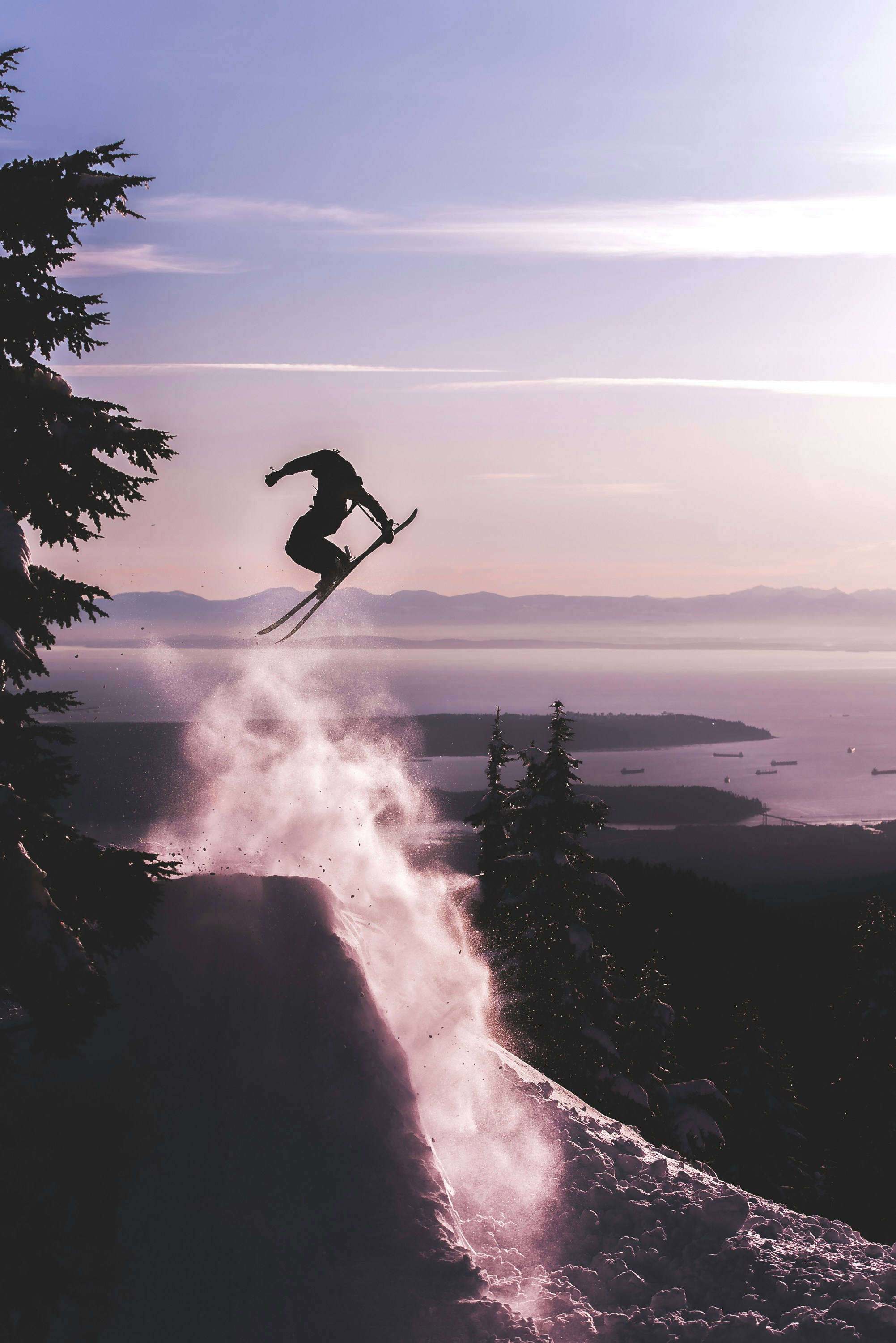剪影,滑雪,滑雪,滑雪,跳跃,山,雪,湖,树,抓,跳,把戏,魔术,粉末,人,天空,户外,行动,日落,自然,极限运动