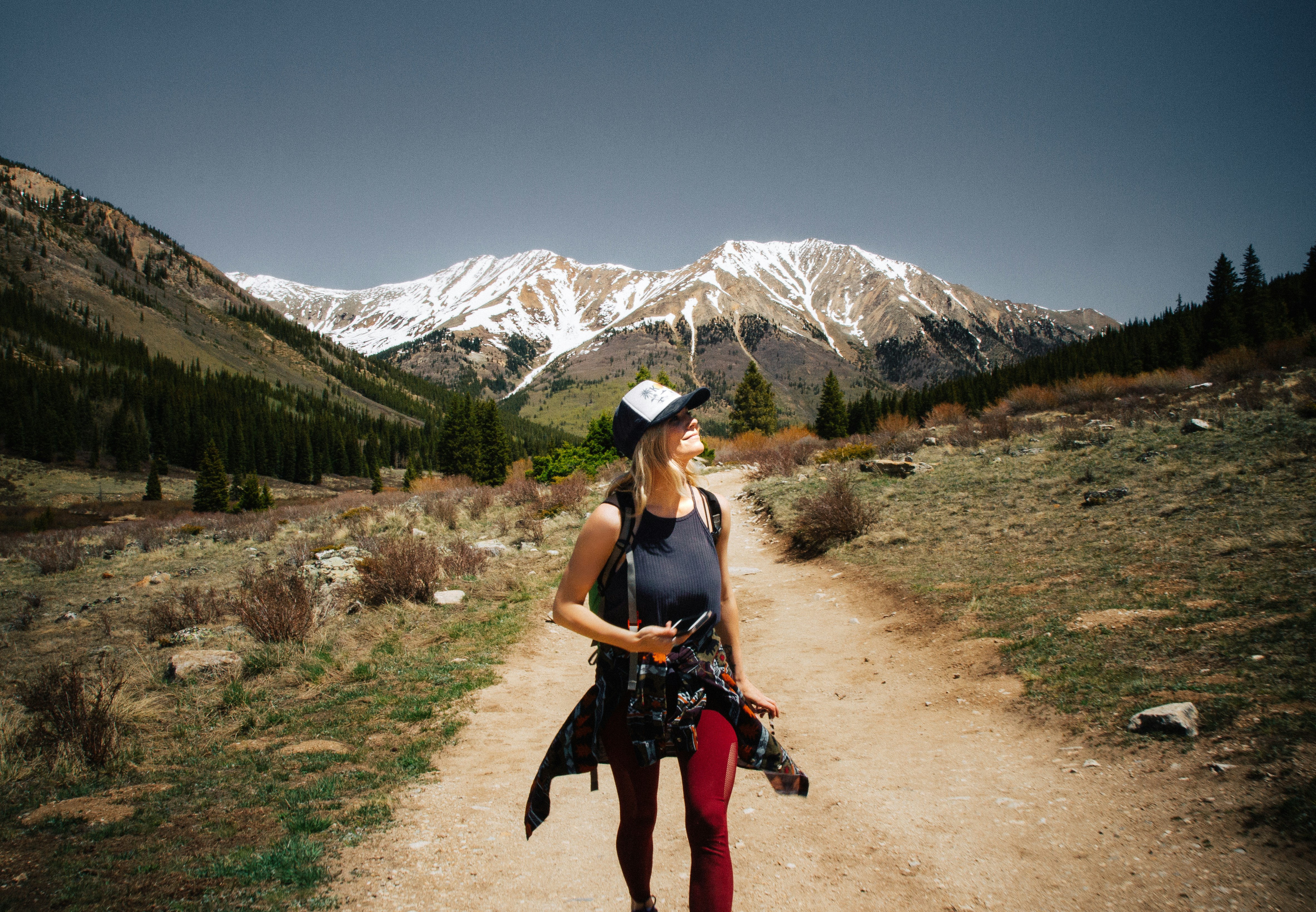 山,山脉,女人,女人,散步,帽子,阳光,冬天,小路,田径,道路,风景,雪,草,田野,小山,树木,林地,森林,微笑