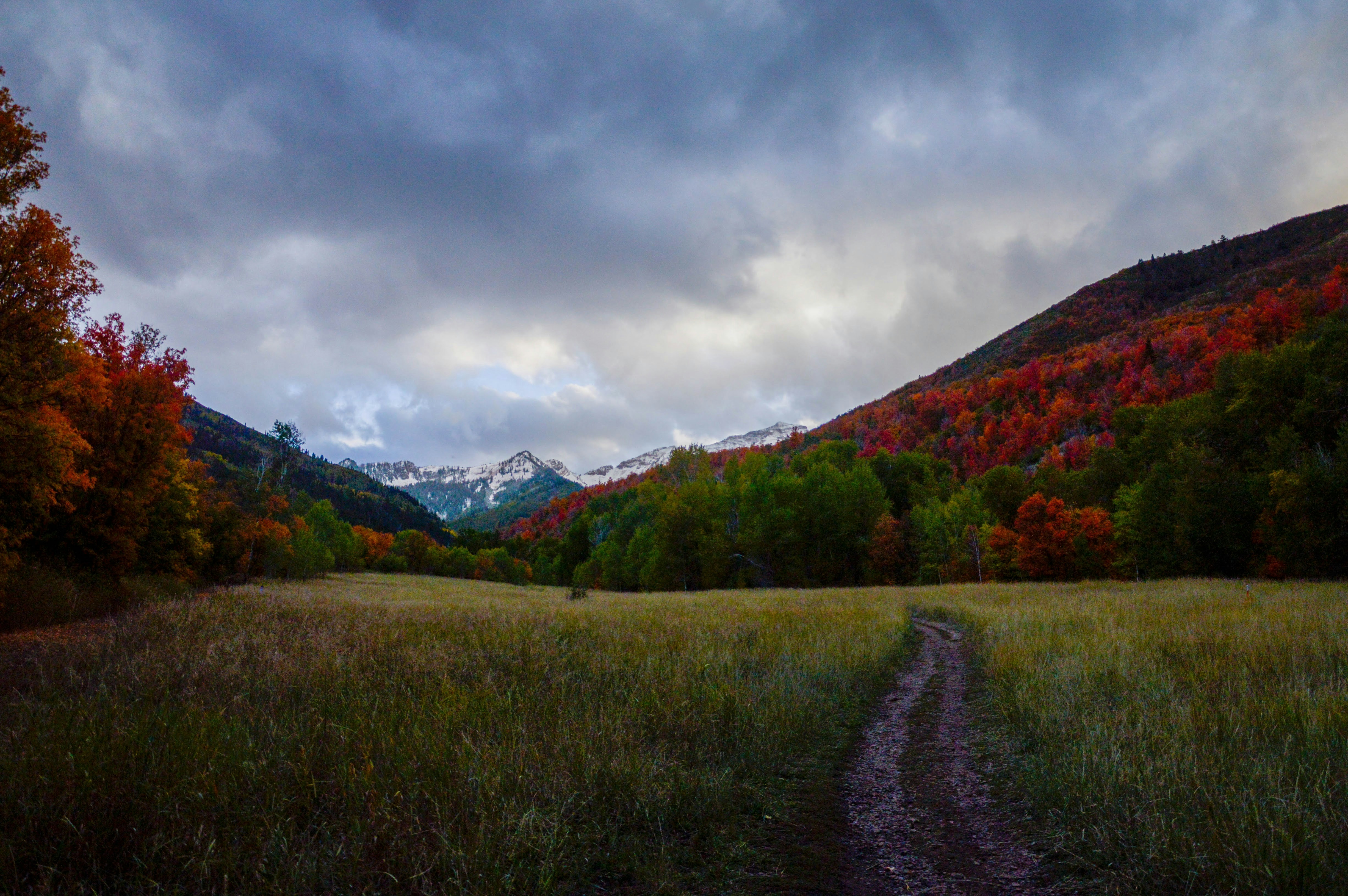 树、林、林、路、草、田、天、景、山、雪、踪、云、秋色、绿、蓝、红、秋