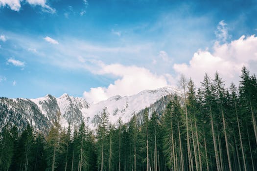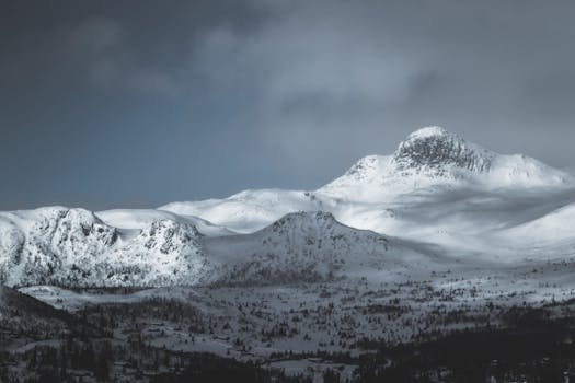 一个高高的雪峰,有一个树木茂密的山坡,在多云的天空下