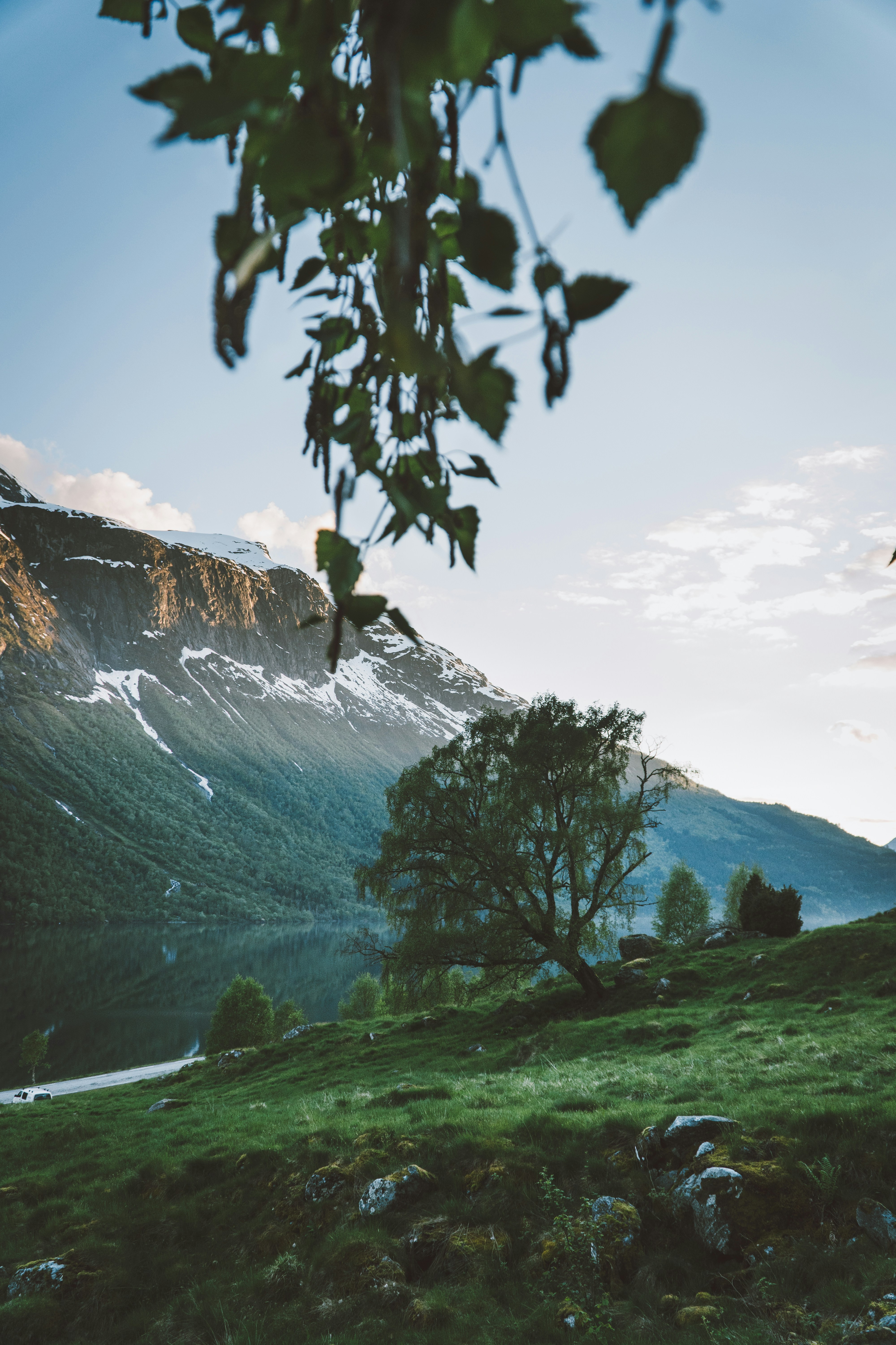 树,山水,自然,山,湖,景,雪,太阳,绿,草,冒险,树枝,叶,叶,嵴,脊,挪威,春天,日落,美丽,夏天
