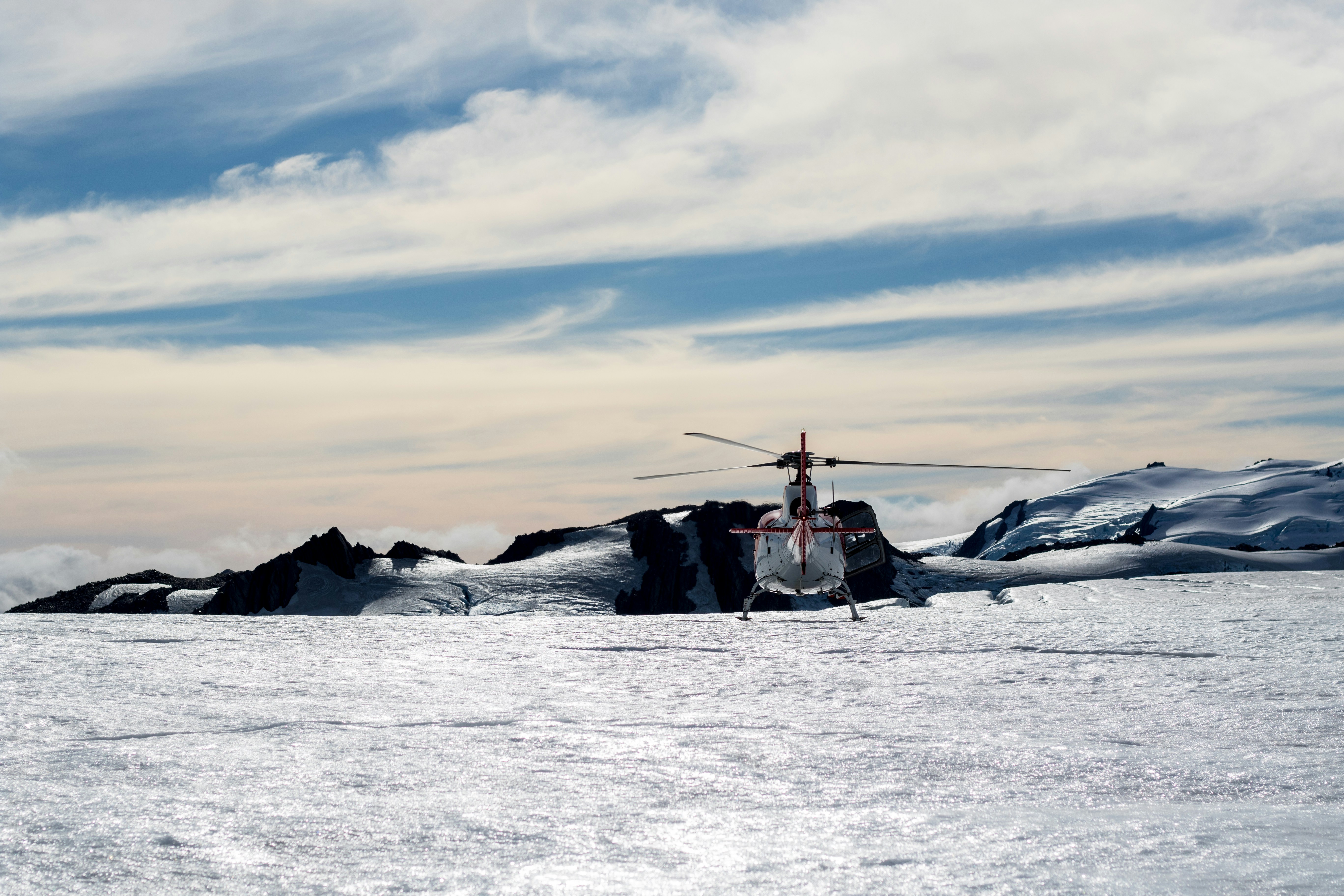 在新西兰福克斯冰川坐在雪地里的直升飞机