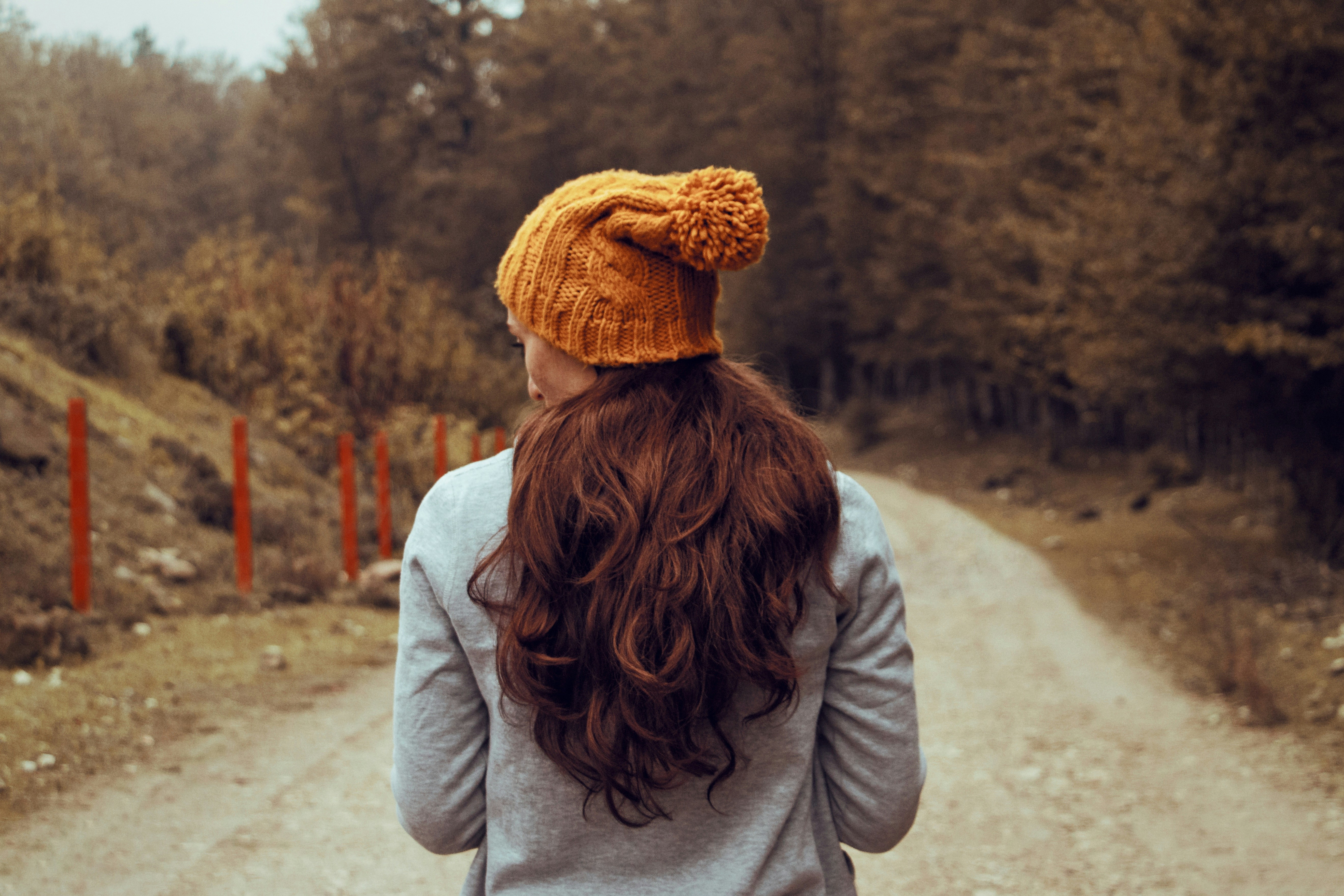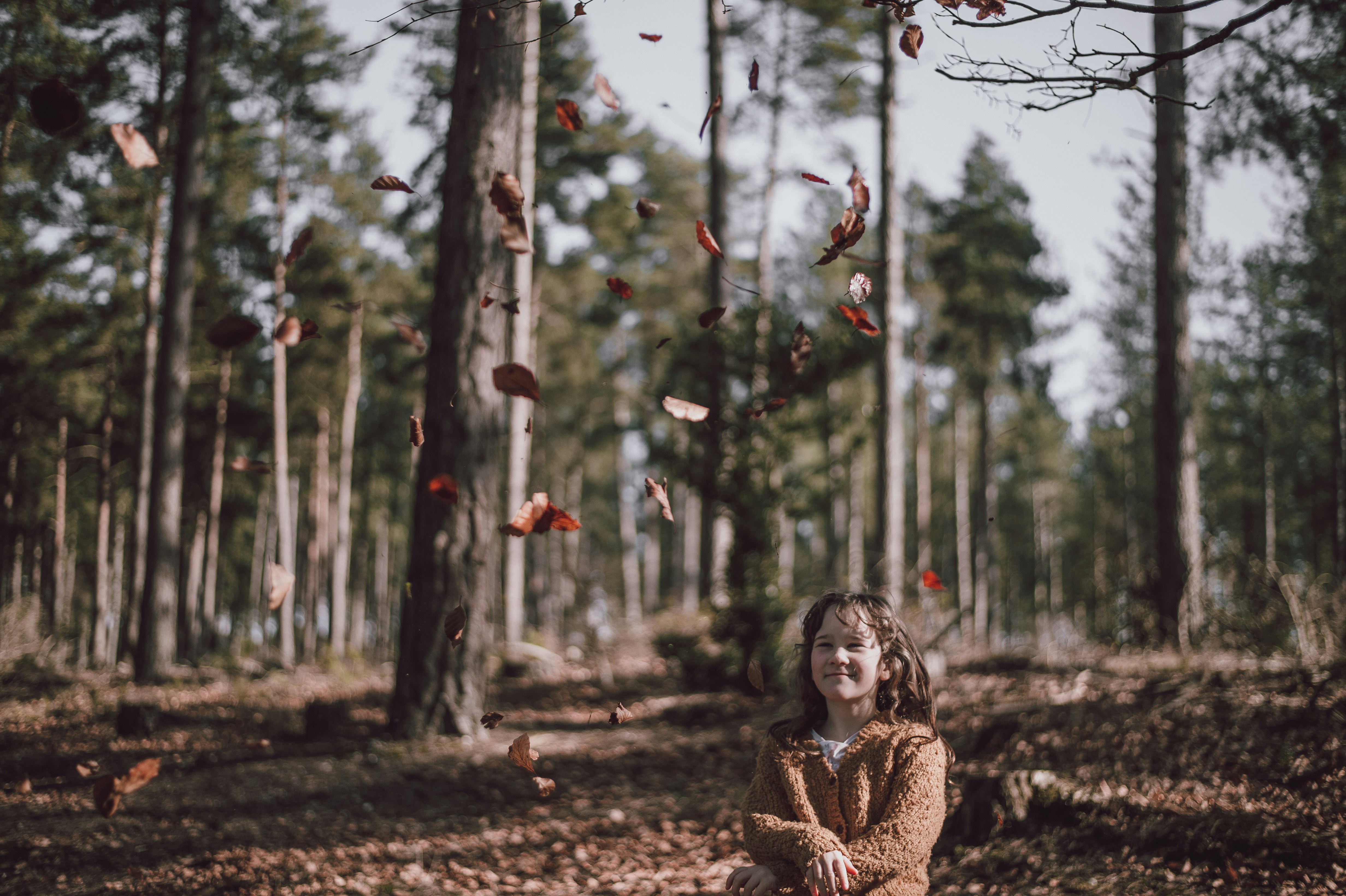 穿着棕色夹克的女孩看着树叶在白天飞翔