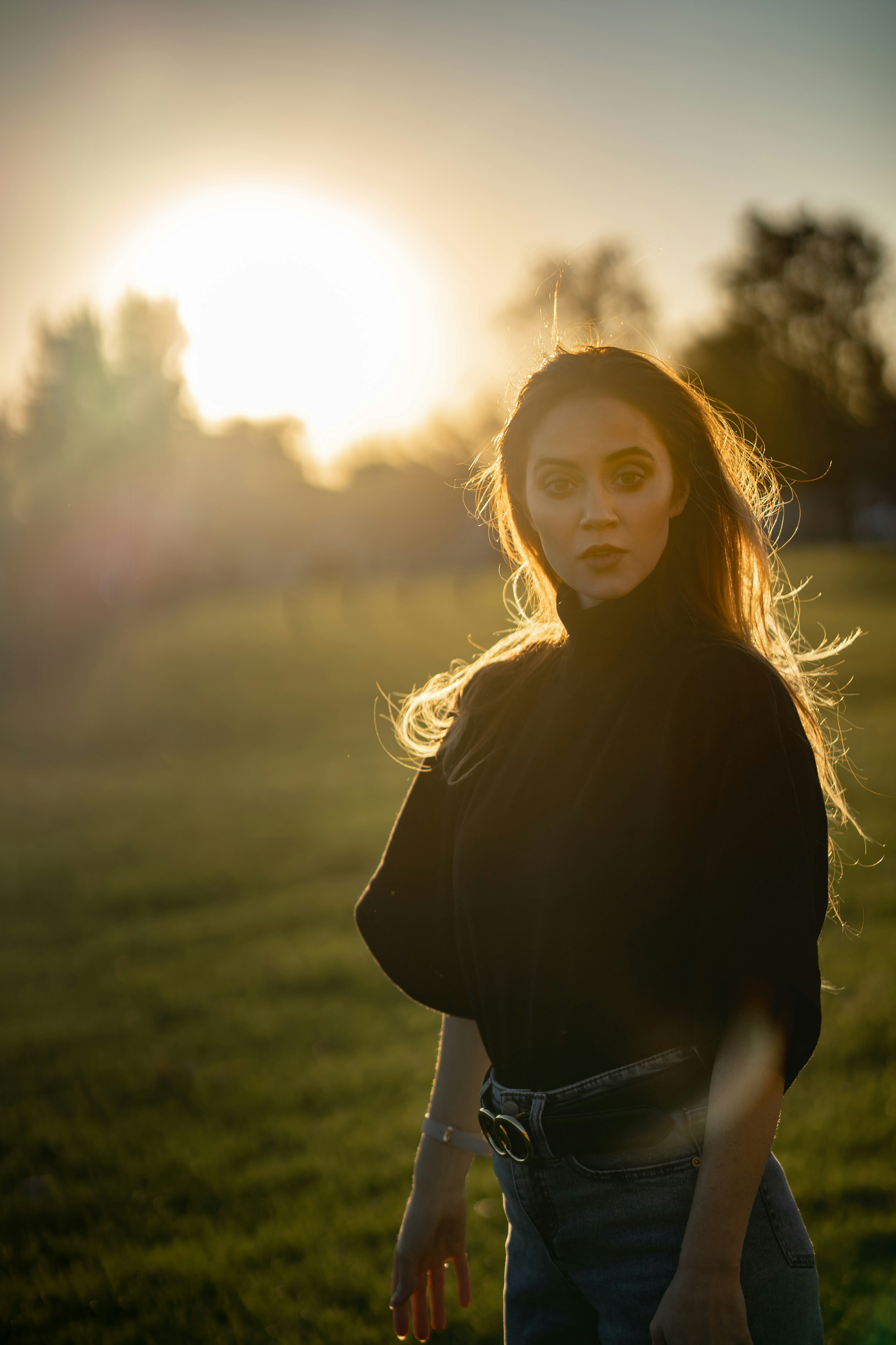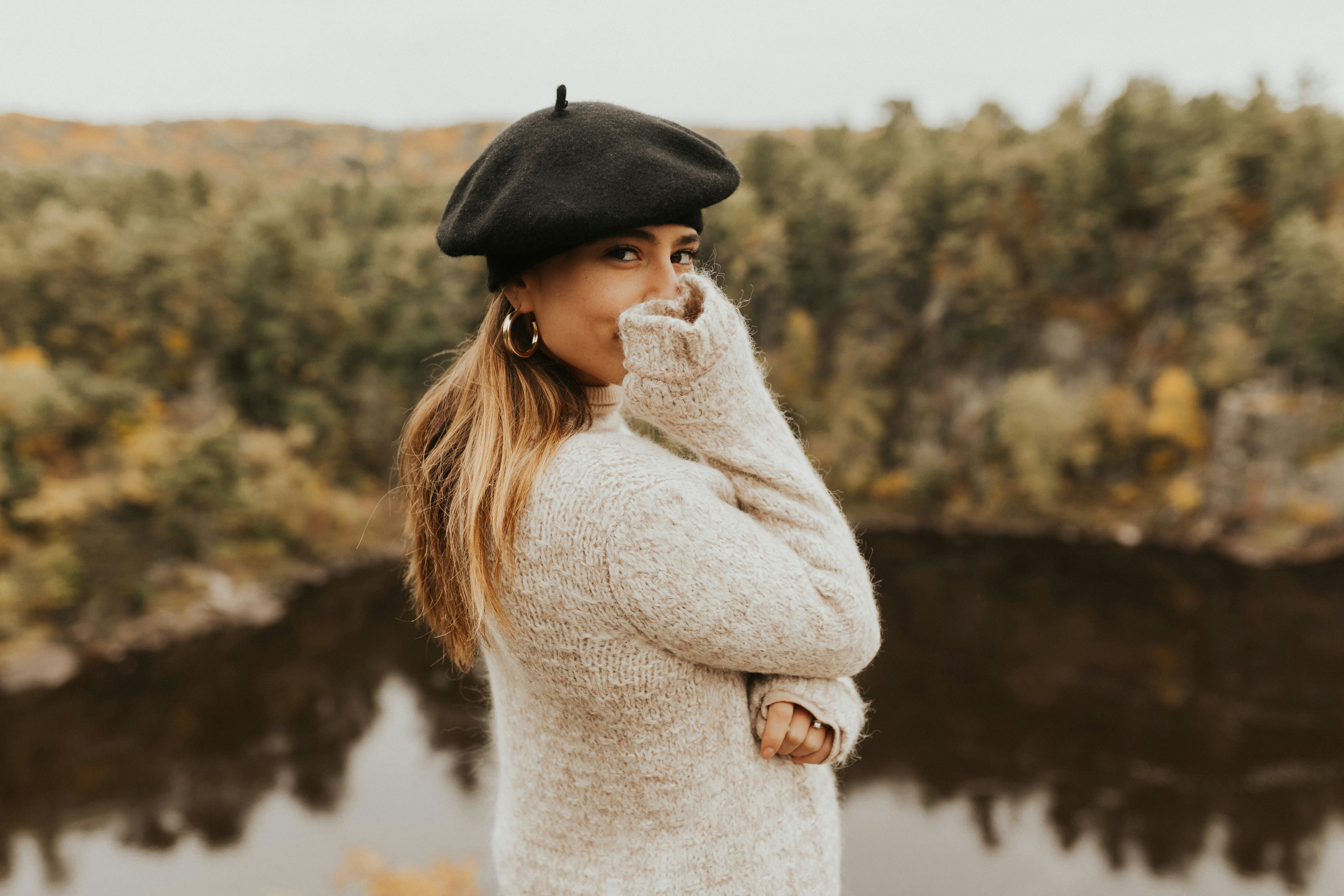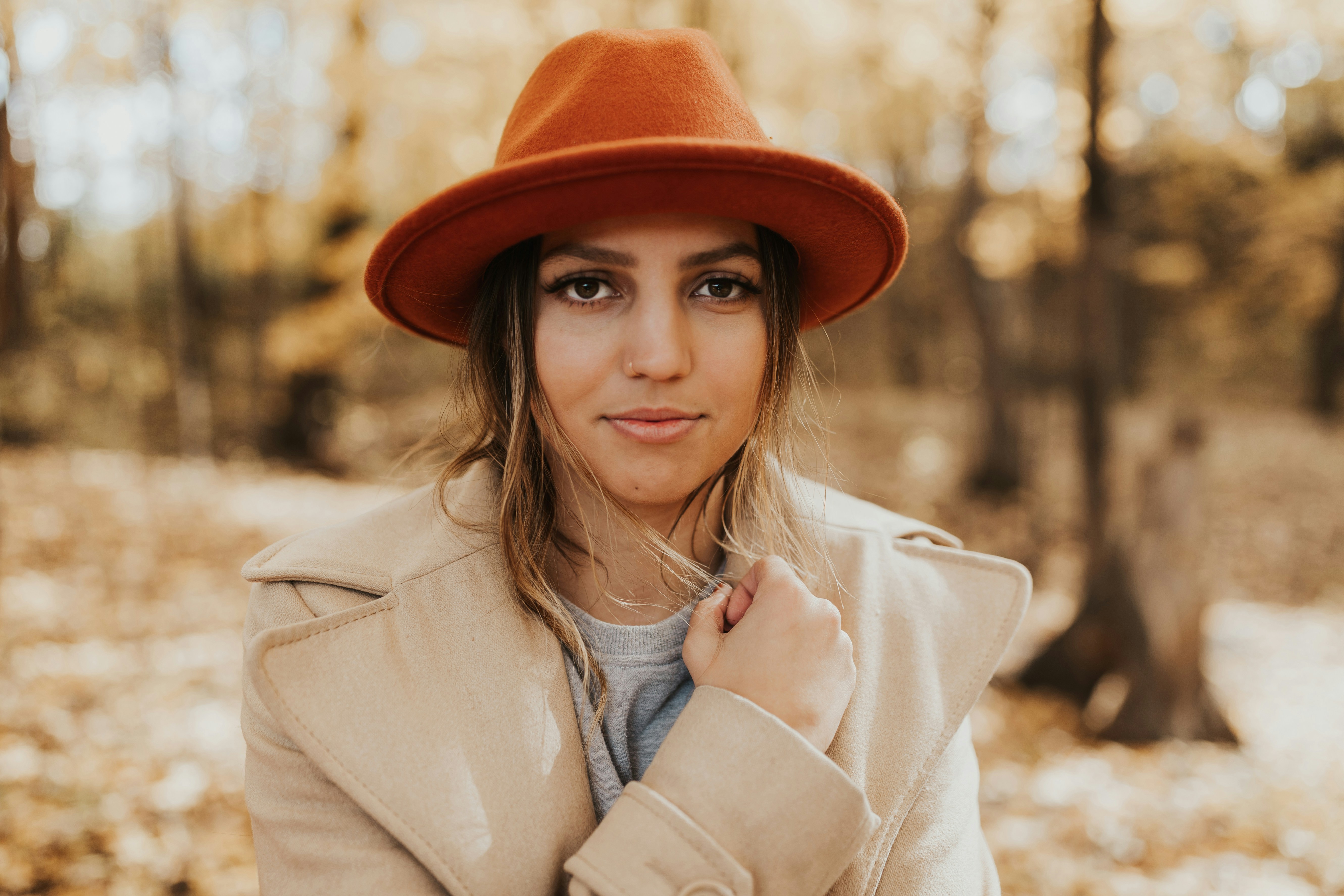 女人,女,树,举起手,开心,达到,贝雷帽,时尚,风格,森林、林地、户外、寻找、南瓜,冬天,女孩微笑,幸福,和平,女孩,秋季时装