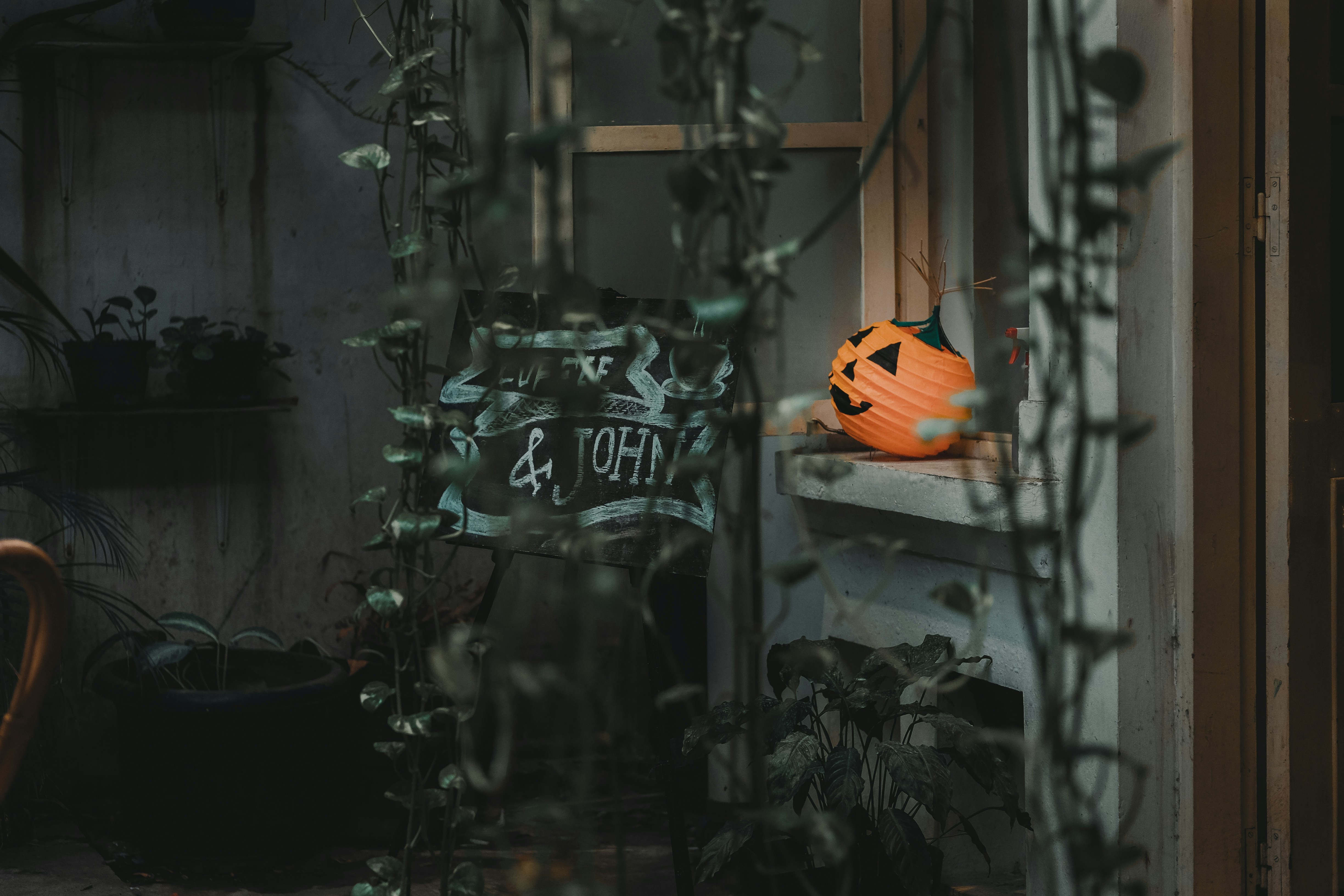 带有蜘蛛网和植物的封闭窗口的灰度照片