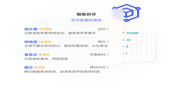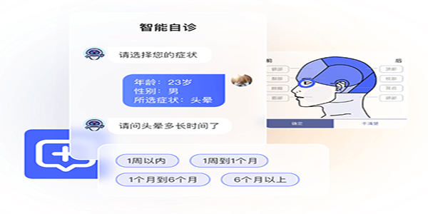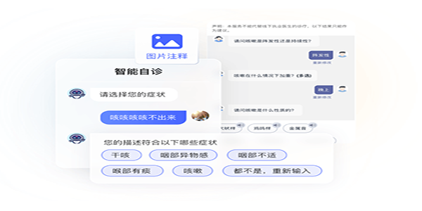 采用AI机器人模拟临床医生问诊思维,与用户进行自然语言交互,智能采集用户病情信息,结合医学知识图谱和机器学习模型,智能评估用户可能的患病情况。用户可随时随地进行健康自测,获取医疗知识,节约医疗资源