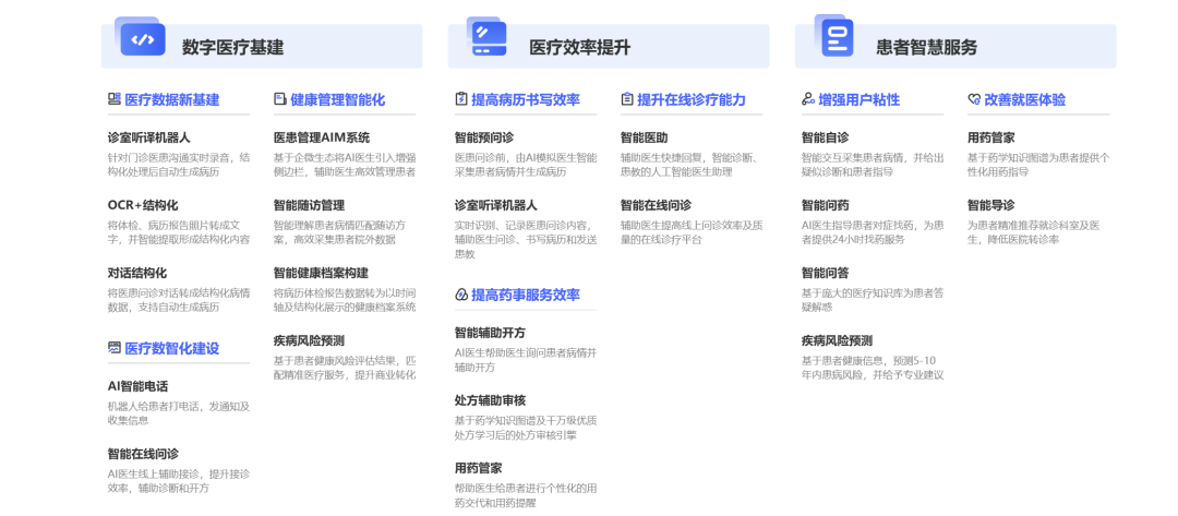 “智能化应用覆盖“诊前-诊中-诊后”完整医患服务流程,各个环节均可提升医生服务效率,帮助提升患者就医体验,辅助运营管理者提升运营质量、降本增效